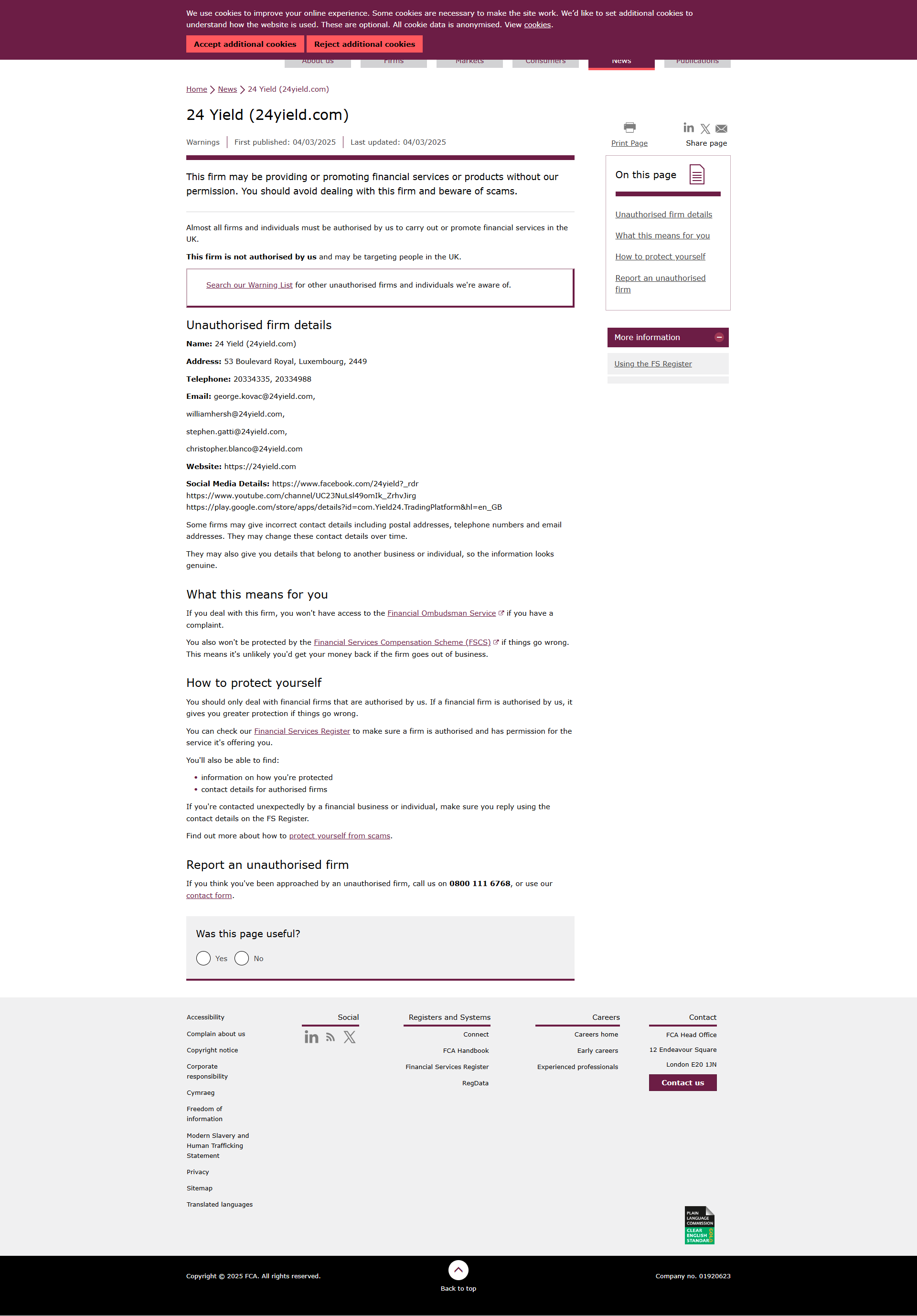 Lista de Aviso da FCA de empresas não autorizadas 24 Yield (24yield.com).