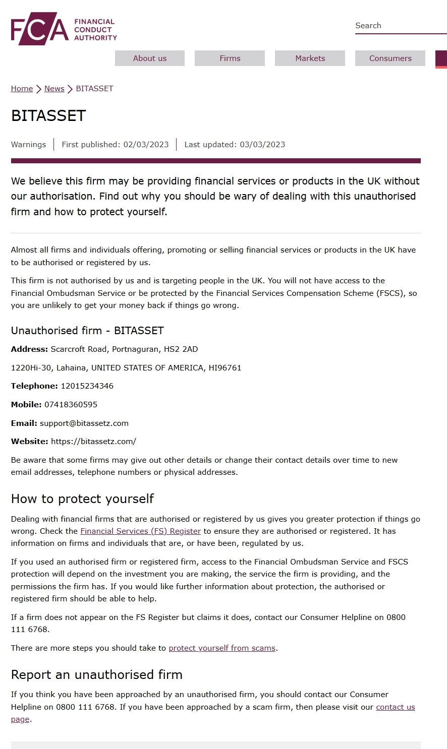 acreditamos que esta empresa pode estar fornecendo serviços ou produtos financeiros no reino unido sem nossa autorização. descubra por que você deve ter cuidado ao lidar com esta empresa não autorizada e como se proteger. quase todas as empresas e indivíduos que oferecem, promovem ou vendem serviços ou produtos financeiros no reino unido precisam ser autorizados ou registrados por nós. esta empresa não é autorizada por nós e tem como alvo pessoas no reino unido. você não terá acesso ao serviço de ouvidoria financeira nem será protegido pelo esquema de compensação de serviços financeiros (fscs), então é improvável que você receba seu dinheiro de volta se as coisas derem errado. empresa não autorizada - Bitasset endereço: scarcroft road, portnaguran, hs2 2ad 1220hi-30, lahaina, estados unidos da américa, hi96761 telefone: 12015234346 celular: 07418360595 e-mail: support@ Bitasset Site z.com: https:// Bitasset z.com/ esteja ciente de que algumas empresas podem fornecer outros detalhes ou alterar seus dados de contato ao longo do tempo para novos endereços de e-mail, números de telefone ou endereços físicos. como se proteger lidar com empresas financeiras autorizadas ou registradas por nós oferece maior proteção se as coisas derem errado. verifique o registro de serviços financeiros (fs) para garantir que sejam autorizados ou registrados. ele tem informações sobre empresas e indivíduos que são, ou foram, regulamentados por nós. se você usou uma empresa autorizada ou registrada, o acesso ao serviço de ouvidoria financeira e à proteção do fscs dependerá do investimento que você está fazendo, do serviço que a empresa está fornecendo e das permissões que a empresa tem. se você quiser mais informações sobre proteção, a empresa autorizada ou registrada deve ser capaz de ajudar. se uma empresa não aparecer no registro fs, mas alegar que sim, entre em contato com nossa linha de ajuda ao consumidor pelo telefone 0800 111 6768. há mais etapas que você deve seguir para se proteger de golpes.