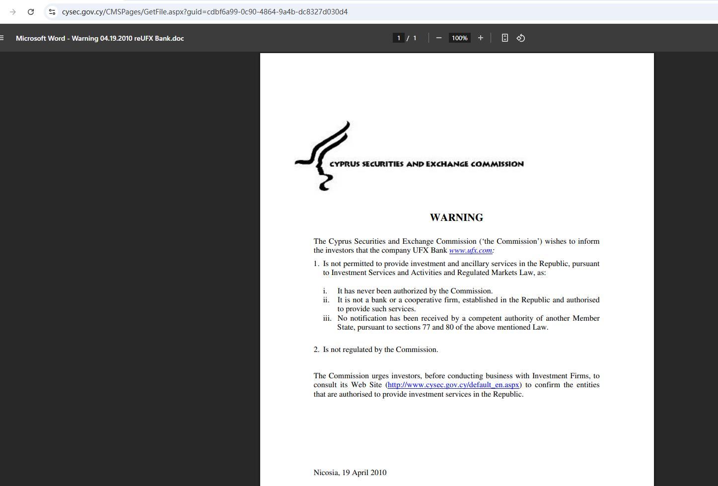 aviso a comissão de valores mobiliários e de câmbio do Chipre ('a comissão') deseja informar os investidores que a empresa UFX banco www. UFX .com: 1. não tem permissão para fornecer serviços de investimento e auxiliares na república, de acordo com a lei de serviços e atividades de investimento e mercados regulamentados, pois: i. nunca foi autorizado pela comissão. ii. não é um banco ou uma empresa cooperativa, estabelecido na república e autorizado a fornecer tais serviços. iii. nenhuma notificação foi recebida por uma autoridade competente de outro estado-membro, de acordo com as seções 77 e 80 da lei acima mencionada. 2. não é regulamentado pela comissão. a comissão recomenda que os investidores, antes de conduzir negócios com empresas de investimento, consultem seu site (http://www.cysec.gov.cy/default_en.aspx) para confirmar as entidades que estão autorizadas a fornecer serviços de investimento na república. nicósia, 19 de abril de 2010