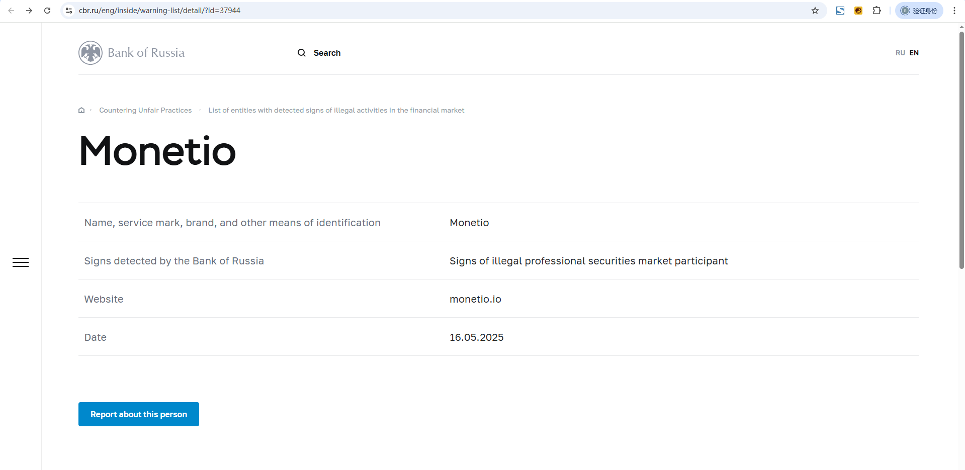 nome, marca de serviço, marca e outros meios de identificação Monetio sinais detectados pelo Banco da Rússia sinais de participação ilegal no mercado de valores mobiliários profissional site Monetio.io data 16.05.2025.