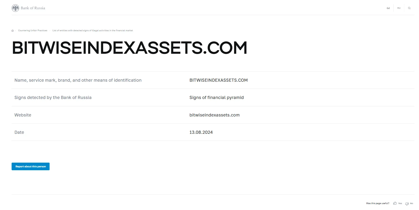 Nome, marca de serviço, marca comercial e outros meios de identificação BITWISEINDEXASSETS.COM Sinais detectados pelo Banco da Rússia Sinais de pirâmide financeira Site bitwiseindexassets.com Data 13.08.2024.