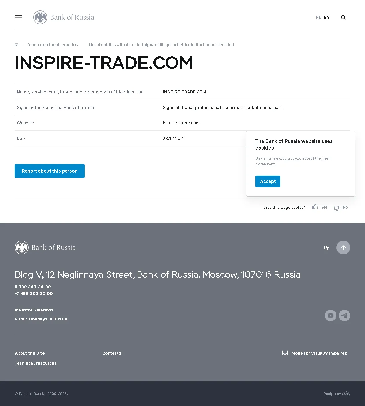 Nome, marca de serviço, marca comercial e outros meios de identificação INSPIRE-TRADE.COM Sinais detectados pelo Banco da Rússia Sinais de participante profissional ilegal no mercado de ações Website inspire-trade.com Data 23.12.2024.
