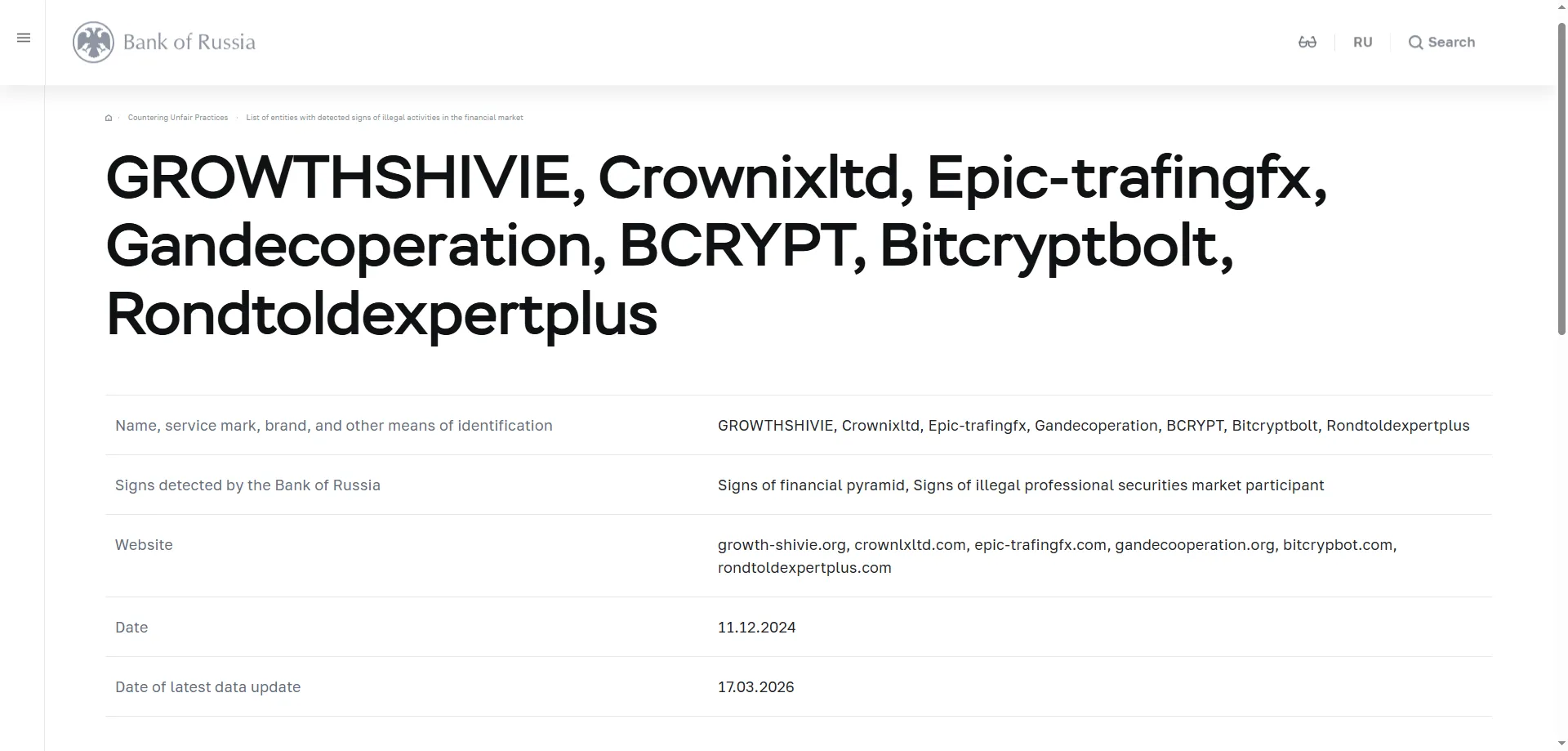 Nome, marca de serviço, marca comercial e outros meios de identificação GROWTHSHIVIE, Crownixltd, Epic-trafingfx, Gandecoperation, BCRYPT, Bitcryptbolt, Rondtoldexpertplus Sinais detectados pelo Banco da Rússia Sinais de pirâmide financeira, Sinais de participante ilegal no mercado de valores mobiliários Website growth-shivie.org, crownlxltd.com, epic-trafingfx.com, gandecooperation.org, bitcrypbot.com, rondtoldexpertplus.com Data 11.12.2024 Data da última atualização de dados 17.03.2026.