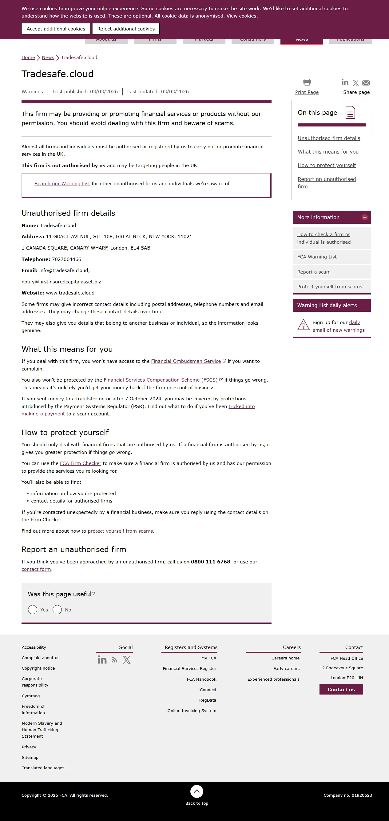 ['Esta empresa pode estar fornecendo ou promovendo serviços ou produtos financeiros sem nossa permissão. Você deve evitar lidar com esta empresa e estar atento a golpes. Quase todas as empresas e indivíduos devem ser autorizados ou registrados por nós para realizar ou promover serviços financeiros no Reino Unido. Esta empresa não está autorizada por nós e pode estar direcionando-se a pessoas no Reino Unido. Consulte nossa Lista de Avisos para outras empresas e indivíduos não autorizados dos quais temos conhecimento. Detalhes da empresa não autorizada Nome: Tradesafe.cloud Endereço: 11 GRACE AVENUE, STE 108, GREAT NECK, NEW YORK, 110211 CANADA SQUARE, CANARY WHARF, Londres, E14 5AB Telefone: 7027064466 E-mail: info@tradesafe.cloud,notify@firstinsuredcapitalasset.biz Site: www.tradesafe.cloud Algumas empresas podem fornecer detalhes de contato incorretos, incluindo endereços postais, números de telefone e endereços de e-mail. Eles podem alterar esses detalhes de contato ao longo do tempo. Eles também podem fornecer detalhes que pertencem a outra empresa ou indivíduo, para que a informação pareça genuína. '].