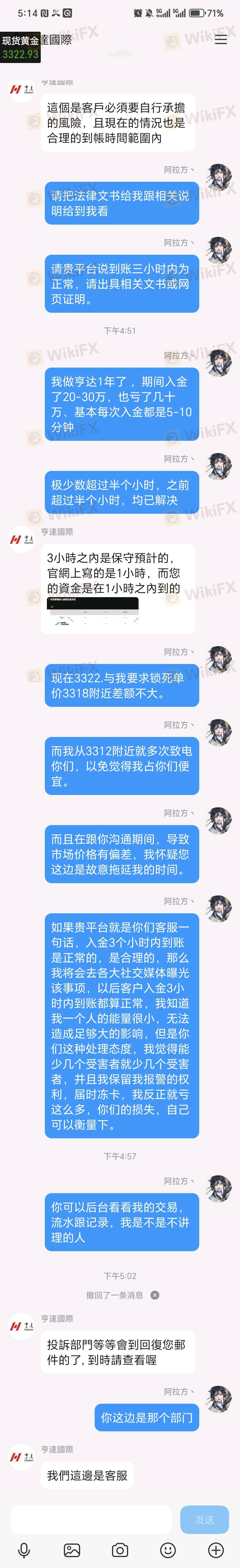 6月6日晚,本人亨达账户因账户通道无法正常入金,导致账户担保比不足引起爆仓!待可以后台可以入金的时候,账户已经爆仓。而且入金通道转账后,接近一个小时才到账户内,导致账户二次爆仓。 此公司平台与其他平台不同的是,当账户可用保证金为负数时,账户就无法风控,完成账户对锁仓位。当发现无法对锁的时候,我及时安排入金。因通道问题导致无法正常入金,待可以入金时候账户已经风控爆仓! 与客服多次反馈说入金3小时内到账都是正常的,所以期间账户有任何风险,都是自己承担?请问下那个平台入金,3个小时才到???