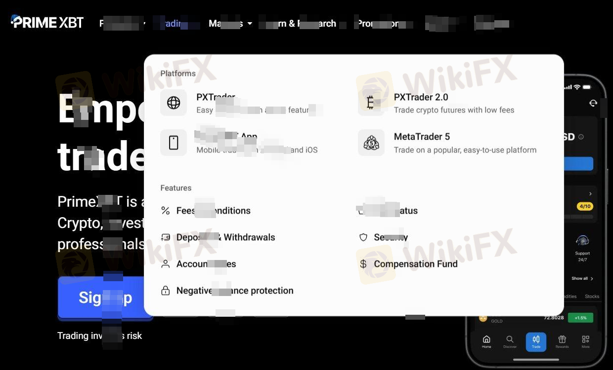 | Plataformas de Negociação | PrimeXBT WebTrader, MetaTrader 5, PrimeXBT App |