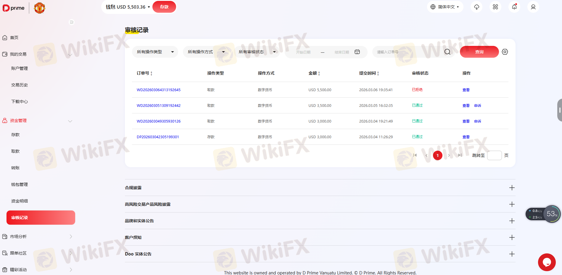 Doo Prime recomenda um valor mínimo de retirada de USD 50, e oferece vários métodos de retirada para atender às necessidades de seus clientes. Para transferências bancárias internacionais, as retiradas podem ser feitas em várias moedas, incluindo EUR, GBP, HKD e USD. O tempo de processamento para transferências bancárias internacionais é relativamente rápido, com os fundos geralmente sendo processados dentro de um dia útil para valores de retirada de até USD 50,000. Para valores de retirada entre USD 50,001 e 200,000, o tempo de processamento se estende para dois dias úteis. Retiradas de USD 200,001 a 1,000,000 requerem aproximadamente cinco dias úteis para processamento, enquanto retiradas acima de USD 1,000,001 podem levar cerca de seis dias úteis para serem concluídas.