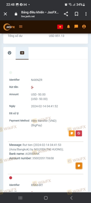 Eu sou o titular da conta MT5 157052, um cliente da JasFX desde novembro de 2023. Lamento ter que reclamar publicamente que a JasFX não conseguiu processar minha solicitação de saque, apesar de minhas várias tentativas de acompanhar esse assunto. Especificamente, enviei 22 e-mails para o suporte_vn@jasfx.com e entrei em contato com a linha direta 1900 099 970 em 11 ocasiões, de 7 de maio de 2024 a 5 de junho de 2024, solicitando que a JasFX processe meu saque de $5.000. No entanto, a JasFX ainda não atendeu a essa solicitação. Apesar de minhas contínuas lembranças e ênfase na urgência desse problema, a JasFX apenas respondeu "reconhecendo o problema" e afirmando que "investigará as informações e responderá o mais rápido possível", sem fornecer nenhuma razão específica para o atraso. Sinto que a JasFX está atrasando intencionalmente e ignorando minha solicitação para apropriar-se indevidamente dos ativos dos investidores. A falha da JasFX em processar meu saque me causou danos significativos. Tive que suportar perdas por não poder continuar negociando e também enfrentei dificuldades em minhas despesas diárias. Esse atraso ou recusa em processar ordens de saque não apenas viola os compromissos da JasFX com os investidores, mas também mina a confiança da comunidade no mercado financeiro. Insto a todos que têm, estão ou planejam negociar na JasFX a serem vigilantes e considerarem cuidadosamente sua decisão. Decidi publicar esta reclamação em várias plataformas online para alertar a comunidade sobre a falha da JasFX em processar solicitações de saque de clientes. Espero que esta postagem ajude outros investidores a evitar problemas semelhantes. Por favor, compartilhe esta postagem para alertar o maior número possível de investidores sobre os riscos envolvidos. Precisamos nos levantar e exigir que a JasFX cesse imediatamente esse comportamento inaceitável.