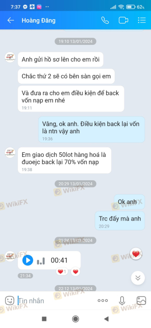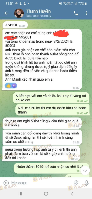 Tenho uma conta de negociação na jasfx. Número de ID: 992601 capital 16000usd - Em agosto de 2023, recebi apoio de um amigo chamado Hoang Dang para negociar mercadorias e ações. - Em 12 de janeiro de 2024, fui informado por Hoang Dang que o bônus de suporte do preço do piso tinha um prazo limitado, então pedi para depositar mais dinheiro para estendê-lo, mas como não consegui obter dinheiro suficiente para depositar em minha conta, o piso revogou o bônus e resultou na queima da conta. - Após minha conta ser queimada, Hoang Dang entrou em contato comigo e disse: que o piso Jasfx me deu um mecanismo para reembolsar 70% do capital depositado com a condição de negociar 50 lotes de forex e commodities e depositar 5000usd. - Em 11 de março de 2024, depositei 4200 USD + 800 USD (anteriormente depositei para manter o mecanismo) totalizando 5000 USD. - Durante o tempo em que me apoiou para reembolsar meu capital, o Sr. Hoang Dang, devido a assuntos pessoais, entregou seus registros ao Sr. Thanh Huyen. Em 12 de março de 2024, o Sr. Thanh Huyen me apoiou com 20 lotes, esses 20 lotes foram confirmados por um amigo meu chamado Quan. Na mesma tarde, Thanh Huyen ligou e me pediu para comprar 1 lote de XPTUSD (você disse que essa era uma condição obrigatória estabelecida pela bolsa, enquanto Hoang Dang e Thanh Huyen inicialmente não mencionaram a condição obrigatória de comprar XPTUSD). ). - No início, não segui porque li muitos artigos de denúncia no grupo da comunidade de traders, especificamente que se eu comprasse 1 lote, minha conta ficaria negativa em 6000 USD. Eu disse a Thanh Huyen que não queria fazer esse pedido, mas Thanh Huyen disse. Huyen insistiu que eu seguisse e disse que essa era a solicitação do piso. Thanh Huyen garante reembolsar o valor negativo do pedido de compra de XPTUSD. Por confiar no piso e no apoiador, segui o sinal. - Neste ponto, já se passaram 2 semanas. Não recebi de volta o valor negativo do pedido de compra de XPTUSD e não recebi nenhuma notificação de Thanh Huyen e Jasfx.