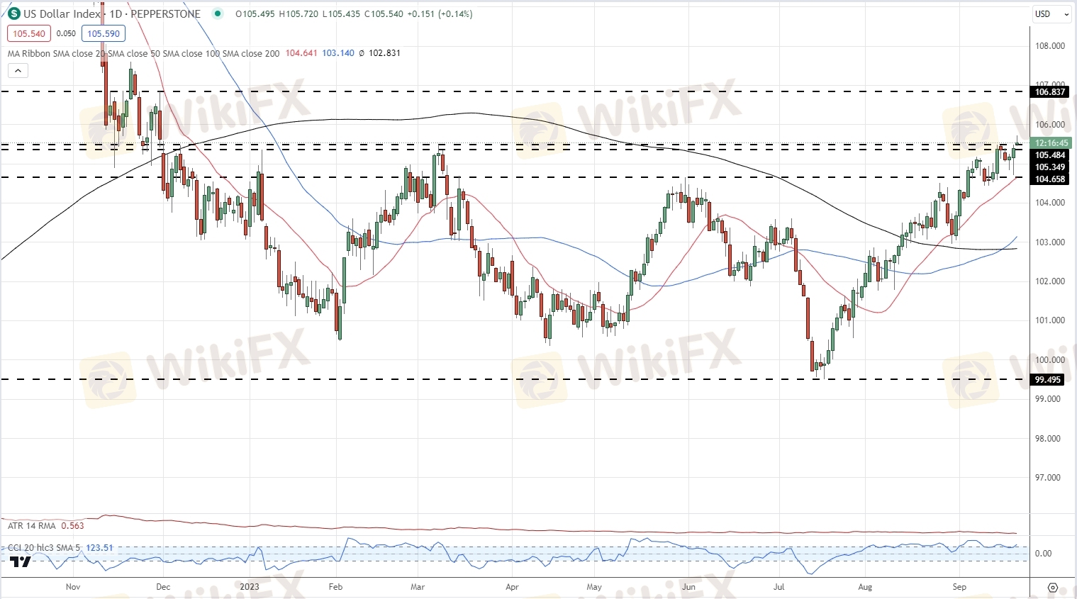O dólar americano teve um rali desde o início do terceiro trimestre, retornando aos níveis vistos pela última vez em ambos os lados de dezembro do ano passado, à medida que o Federal Reserve apertou a política monetária aumentando as taxas de juros cada vez mais. O Federal Reserve deixou as taxas inalteradas em sua reunião de setembro, mas alertou que poderia haver outro aumento da taxa de juros se as condições econômicas justificassem. Embora a reunião de setembro tenha tido um tom globalmente hawkish, o Presidente Powell afirmou que o banco central dos EUA "prosseguirá com cuidado" ao avaliar se é necessária uma nova política de aperto. O Presidente Powell usou a mesma linguagem no recente Simpósio de Jackson Hole, em seu discurso principal. Essa flexibilidade permite ao Fed manter as taxas inalteradas pelo restante do ano, se considerado necessário.