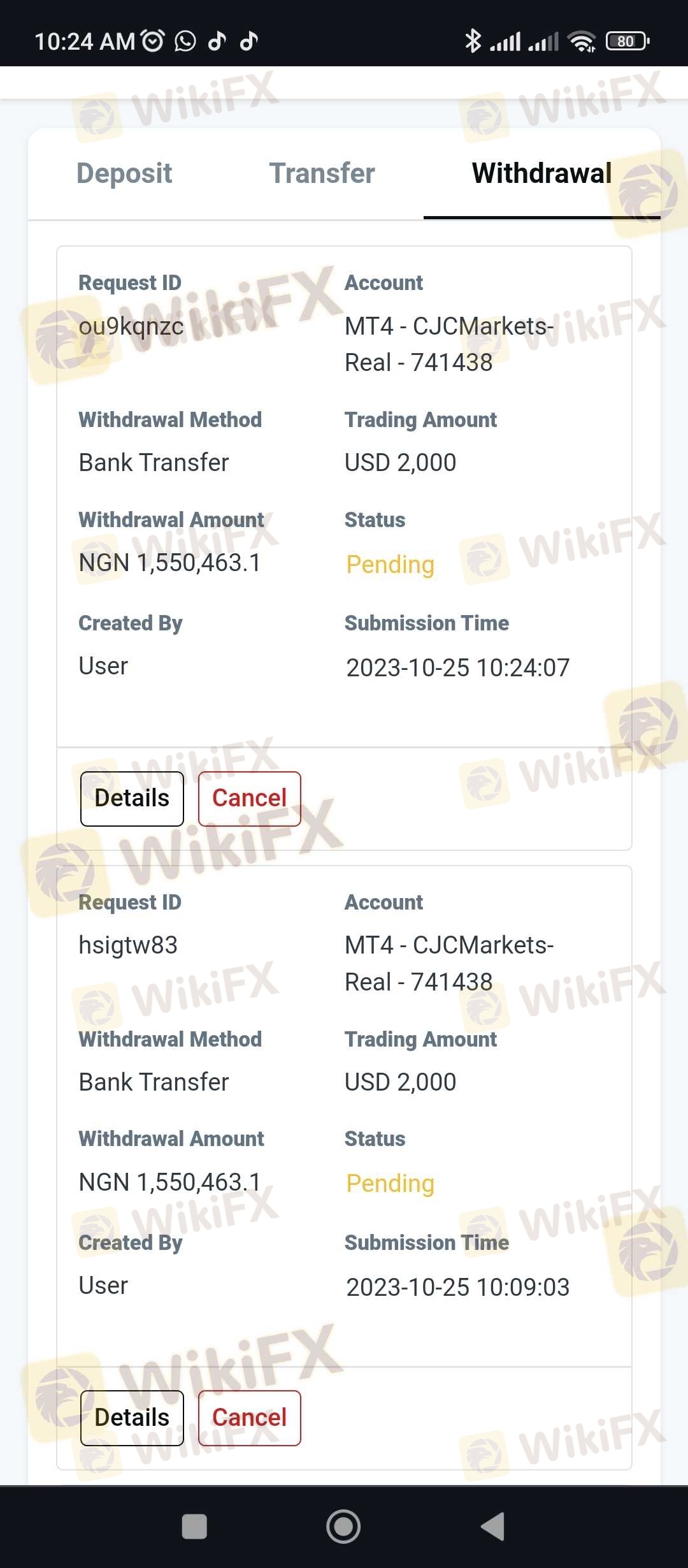 Tenho negociado com a CJC Markets em Lagos, Nigéria, durante 2 anos. Tenho tentado efetuar uma retirada, mas ela continua a mostrar como pendente. A CJC Markets, aqui em Lagos, Nigéria, enviou-me um e-mail informando que encerraram as operações do seu escritório na Nigéria. Desde então, não tenho conseguido efetuar a retirada. A minha retirada continua a indicar 'PENDENTE', sem que os fundos sejam transferidos para a minha conta pessoal. Por favor, ajudem. Visitei o escritório deles aqui em Lagos para verificar e confirmei que era verdade, eles encerraram as operações e não têm planos de reembolsar o meu dinheiro. Apenas quero o meu dinheiro de volta. Suspeito de uma fraude em curso. Até agora, já negociei mais de $5000. Anexo os detalhes relevantes para auxiliar na investigação.