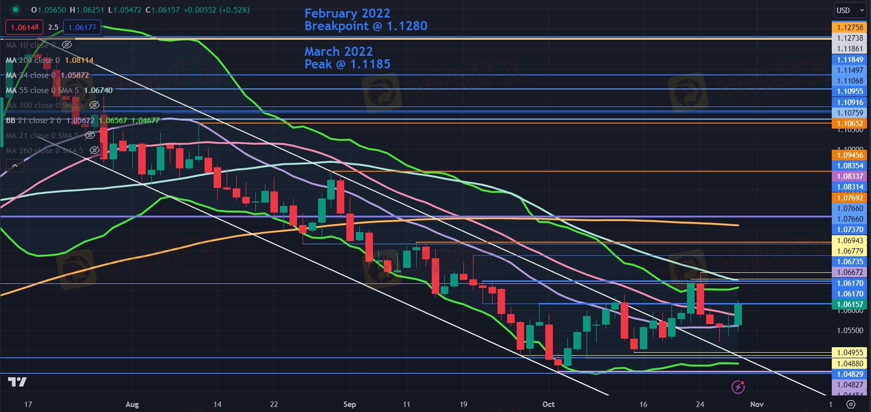 O EUR/USD rompeu claramente a parte superior de um canal de tendência descendente no início da semana passada, ultrapassando brevemente os níveis de resistência menores perto de 1,0680 para atingir uma alta em 1,0695.