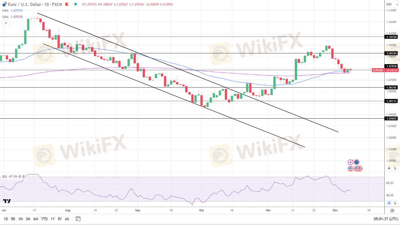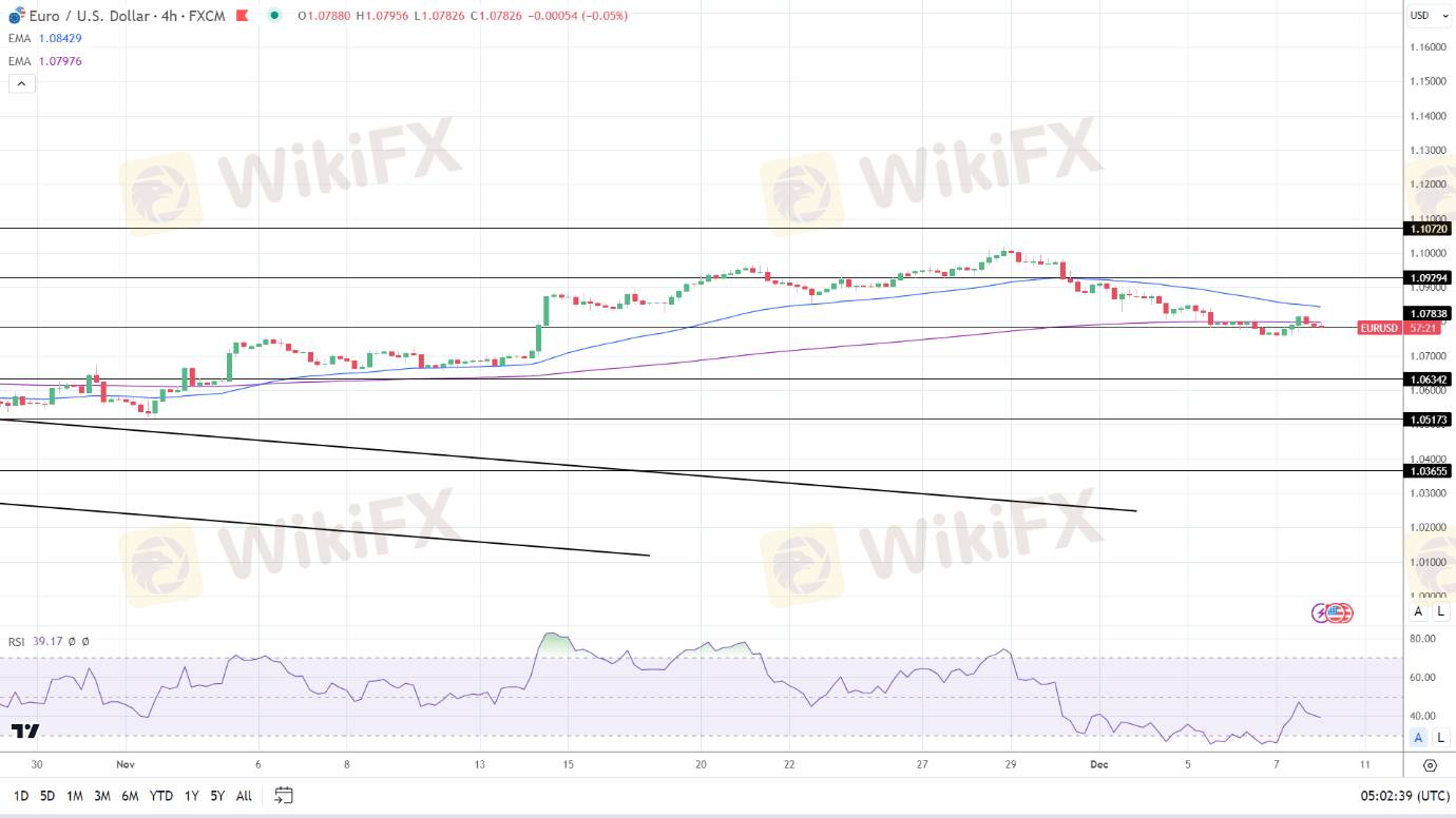 Uma quebra do EUR/USD acima do nível de resistência de $1,07838 e da EMA de 200 dias daria início a uma corrida dos touros em direção à EMA de 50 dias.