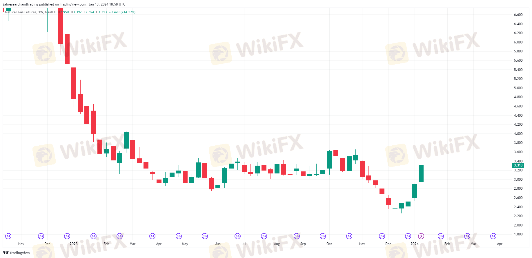 Na semana passada, os futuros de gás natural subiram para $3.313, marcando um aumento de 14,52%. Esse aumento foi predominantemente impulsionado por temperaturas abaixo de zero, resultando em uma forte demanda por aquecimento.
