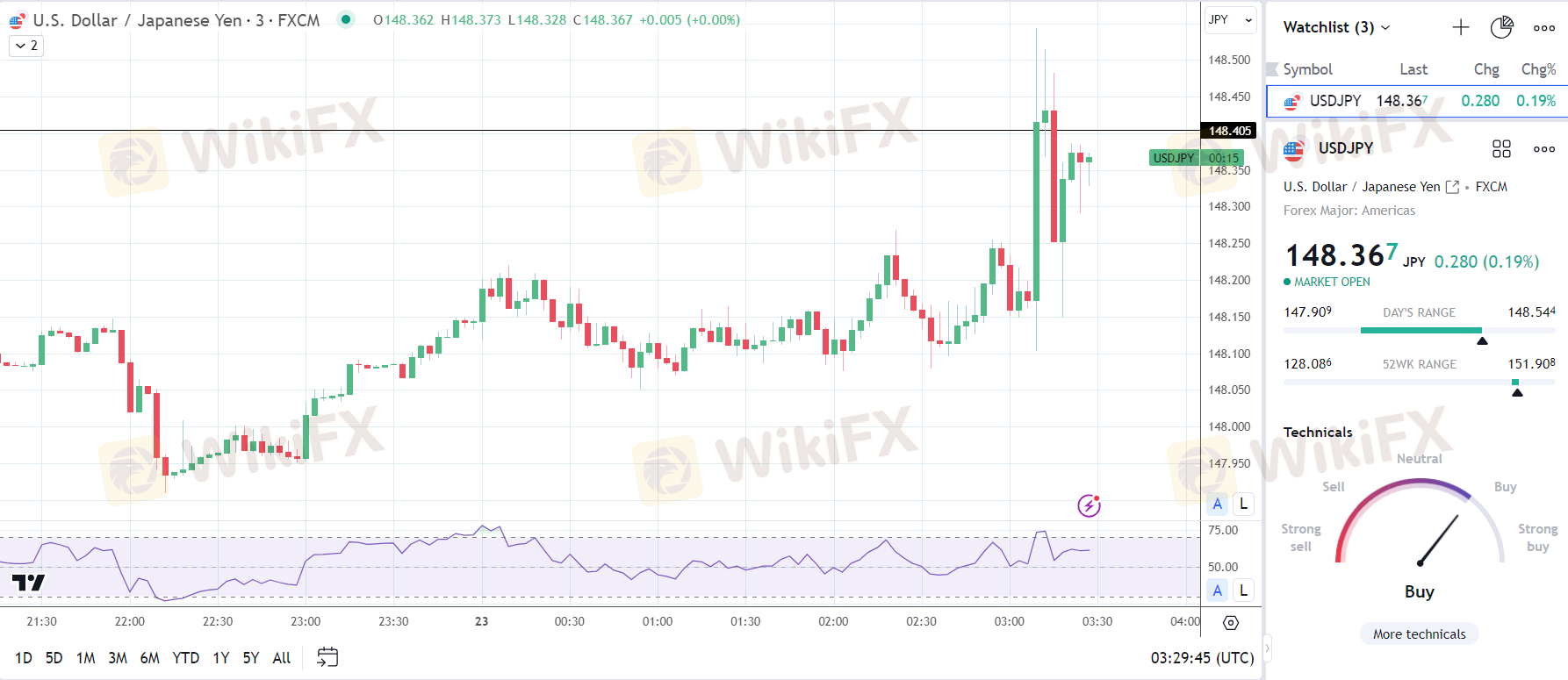 Antes da decisão de política monetária do BoJ, o USD/JPY caiu para uma baixa de 147,909 antes de subir para 148,268.