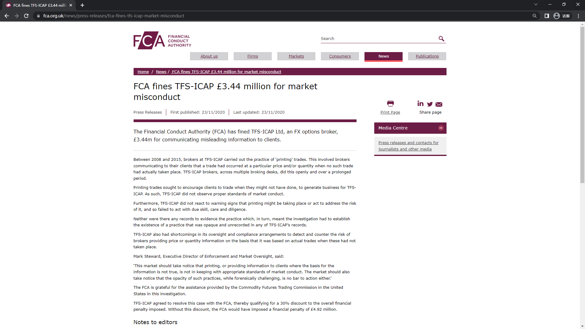 A Financial Conduct Authority (FCA) multou a TFS-ICAP Ltd, uma corretora de opções de câmbio, em £ 3,44 milhões por comunicar informações enganosas aos clientes. Entre 2008 e 2015, os corretores da TFS-ICAP realizaram a prática de negócios de 'impressão'. Isso envolvia corretores comunicando a seus clientes que uma negociação ocorreu a um determinado preço e/ou quantidade quando nenhuma negociação realmente ocorreu. Os corretores TFS-ICAP, em várias mesas de corretagem, fizeram isso abertamente e por um período prolongado. Os negócios de impressão procuravam encorajar os clientes a negociar quando talvez não o fizessem, para gerar negócios para o TFS-ICAP. Como tal, a TFS-ICAP não observou padrões adequados de conduta de mercado. Além disso, o TFS-ICAP não reagiu aos sinais de alerta de que a impressão pode estar ocorrendo ou agiu para lidar com o risco da mesma e, portanto, não agiu com a devida habilidade, cuidado e diligência. Tampouco existiam registros que comprovassem a prática, o que, por sua vez, obrigava a investigação a apurar a existência de uma prática opaca e não registrada em nenhum dos registros do TFS-ICAP. O TFS-ICAP também teve deficiências em seus acordos de supervisão e conformidade para detectar e combater o risco de corretores fornecerem informações de preço ou quantidade com base em negociações reais quando estas não ocorreram. Mark Steward, Diretor Executivo de Fiscalização e Supervisão de Mercado, disse: 'Este mercado deve estar ciente de que imprimir ou fornecer informações a clientes onde a base para a informação não é verdadeira, não está de acordo com os padrões apropriados de conduta do mercado. O mercado também deve estar ciente de que a opacidade de tais práticas, embora seja um desafio forense, também não impede a ação.' A FCA agradece a assistência prestada pela Commodity Futures Trading Commission nos Estados Unidos nesta investigação. A TFS-ICAP concordou em resolver este caso com a FCA, qualificando-se assim para um desconto de 30% na multa global imposta. Sem esse desconto, a FCA teria imposto uma multa financeira de £ 4,92 milhões.