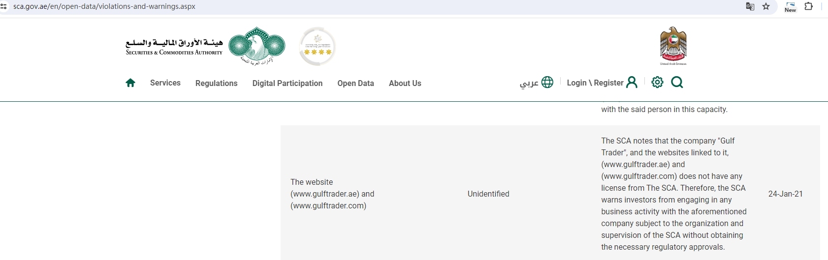 o sca observa que a empresa " GULF TRADER ", e os sites a ele vinculados, (www.gulftrader.ae) e (www.gulftrader.com) não possuem qualquer licença da sca. portanto, a sca alerta os investidores para que não se envolvam em qualquer atividade comercial com a referida empresa objeto à organização e supervisão do sca sem obter as aprovações regulamentares necessárias.