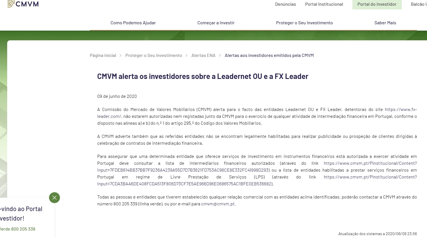 A Comissão do Mercado de Valores Mobiliários (CMVM) alerta para o facto das entidades Leadernet OU e FX Leader, detentoras do site https://www.fx-leader.com/, não estarem autorizadas nem registadas junto da CMVM para o exercício de qualquer atividade de intermediação financeira em Portugal, conforme o disposto nas alíneas a) e b) do n.º 1 do artigo 295.º do Código dos Valores Mobiliários.