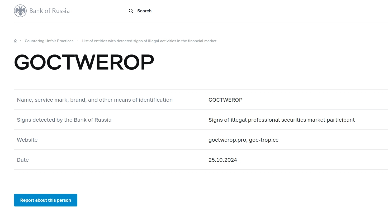 nome, marca de serviço, marca e outros meios de identificação Goctwerop sinais detectados pelo banco da Rússia sinais de site de participante ilegal do mercado de valores mobiliários profissional Goctwerop .pro, goc-trop.cc data 25.10.2024