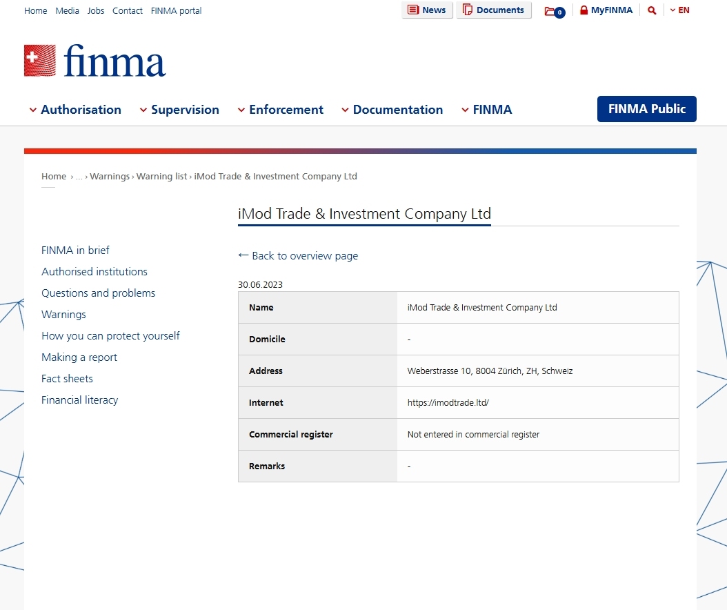 Lista de alerta de empresas e indivíduos não autorizados Lista de alerta iMod Trade & Investment Company Ltd.