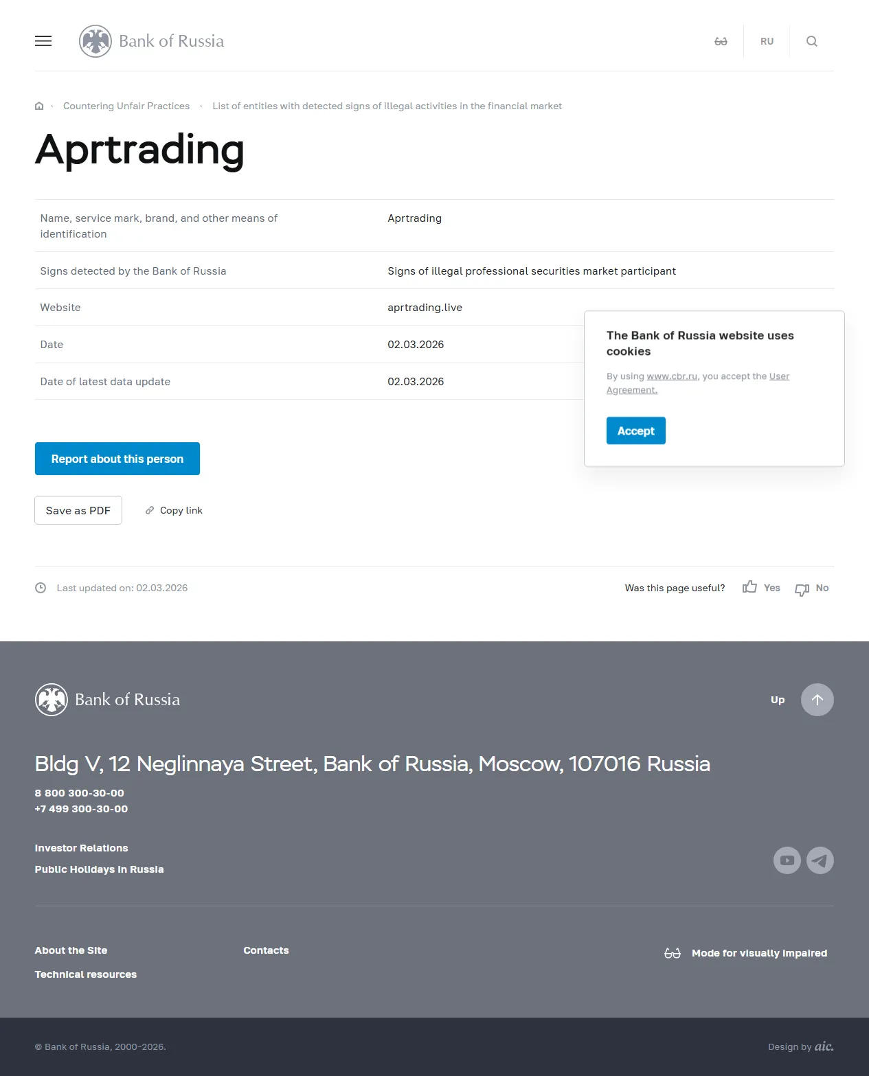 Nome, marca de serviço, marca comercial e outros meios de identificação Aprtrading Sinais detectados pelo Banco da Rússia Sinais de participante profissional ilegal do mercado de ações Website aprtrading.live Data 02.03.2026 Data da última atualização de dados 02.03.2026.
