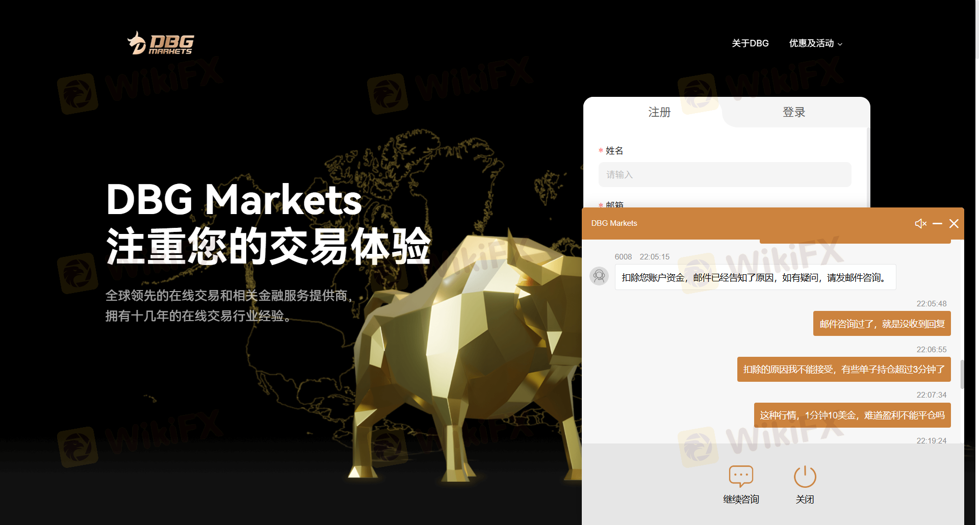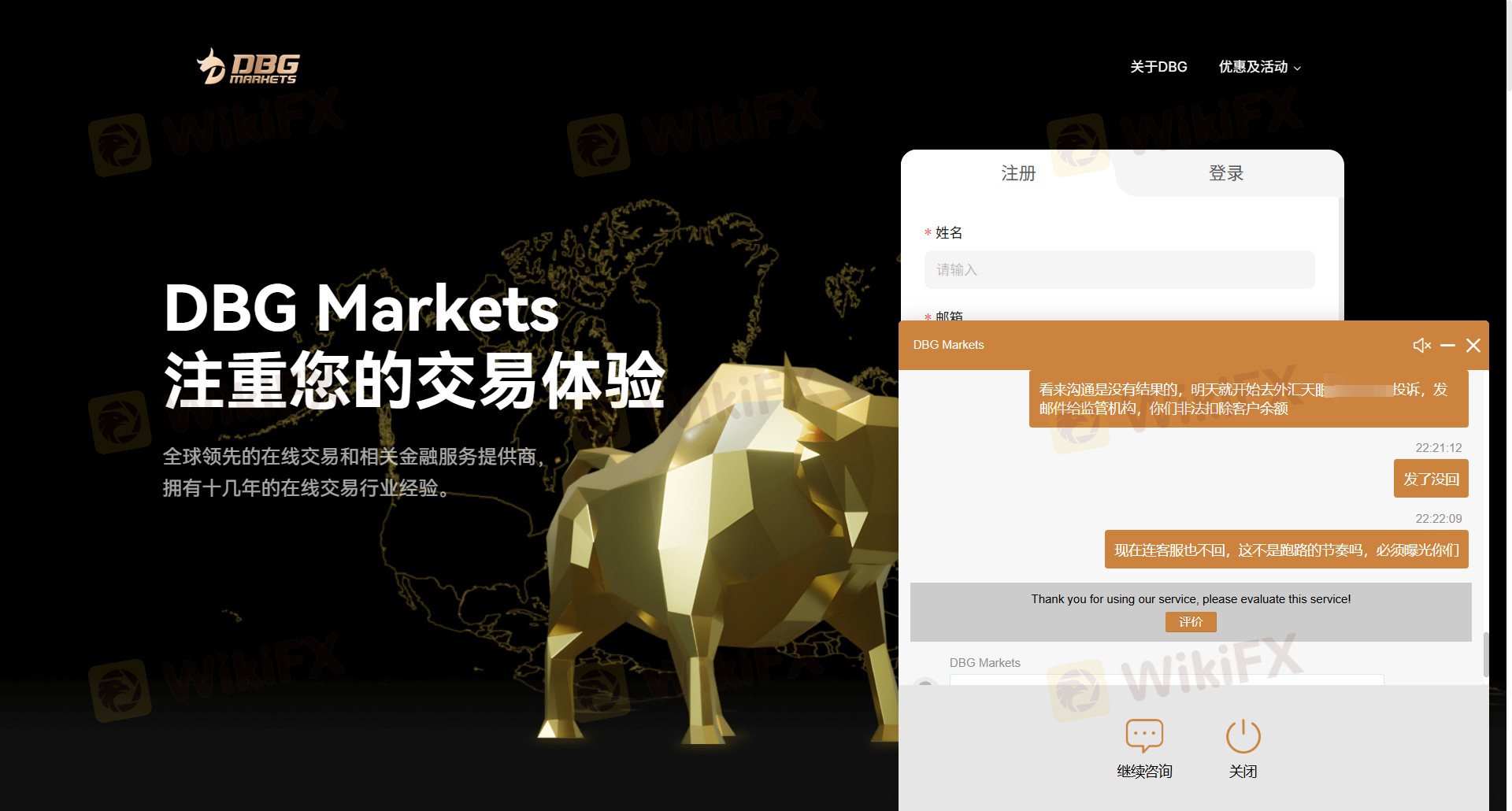 DBG Markets предлагает несколько каналов для обращения клиентов с вопросами или проблемами. Брокерская компания поддерживает команду поддержки, доступную по телефону +27 0861888221 и по электронной почте support@dbgmfx.com. Для тех, кто предпочитает письменное общение, на их веб-сайте доступна форма сообщения, позволяющая клиентам отправлять подробные запросы. Также доступен онлайн-чат, поддерживающий английский, вьетнамский и китайский языки.