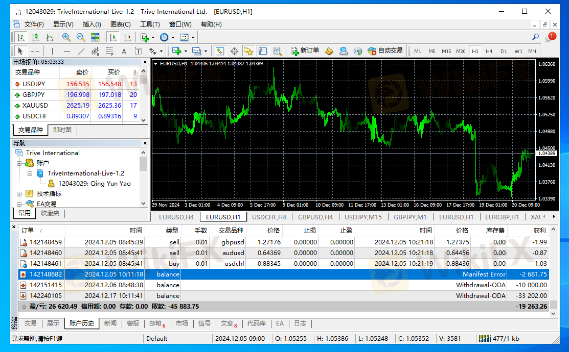 本人姚青云 mt4:12043029 于2024年12月5号 在该平台无故扣除2681.75 这笔资金我没有申请出金 后台直接扣除 我至今没有收到资金 我发现不对劲 剩下的资金 6号全部申请的出金 一直没有处理 天天问在线客服 都是说在处理 一直没有到账 直到17号我跟客服说要投诉 才到账 这个平台不靠谱 希望广大汇友 不要入坑