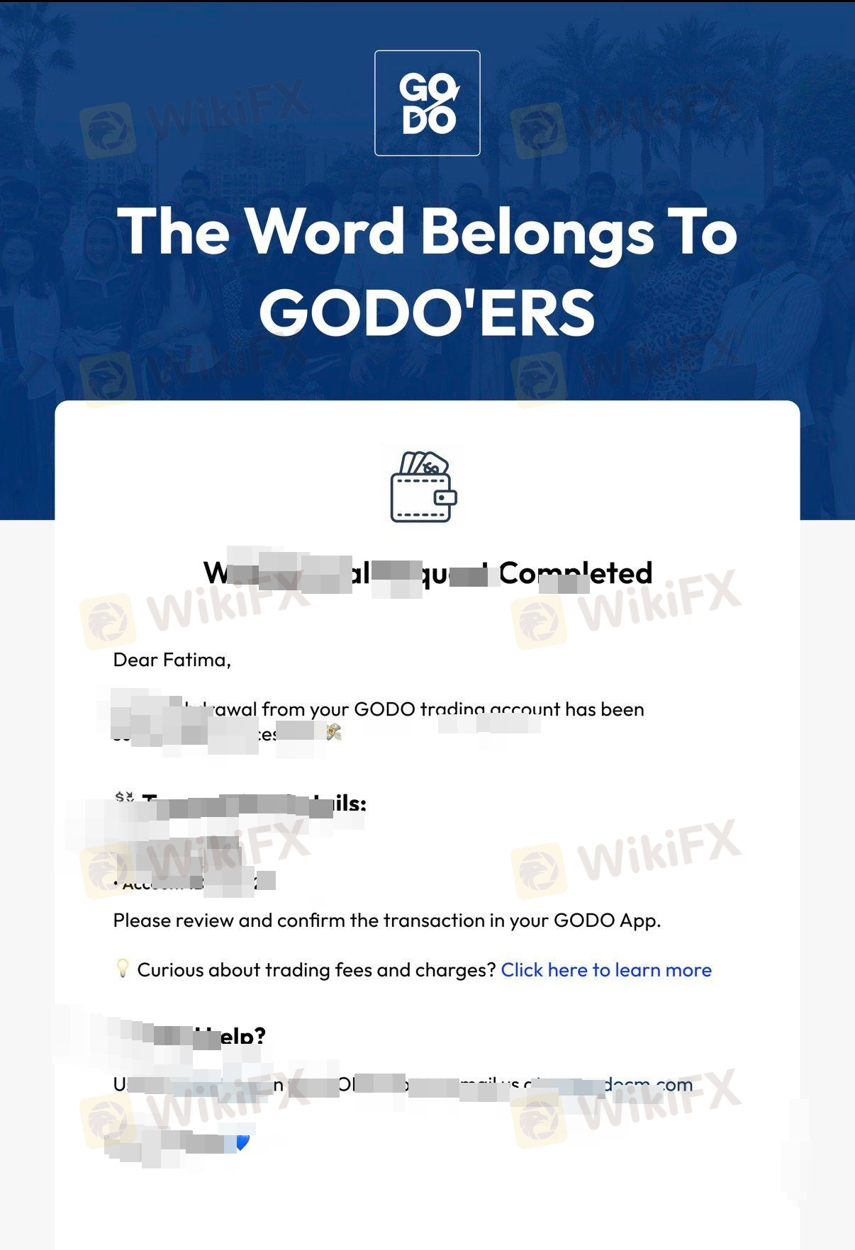 GODO, является, по предположению, форекс и CFD брокером, зарегистрированным на Маврикии, который утверждает, что предоставляет своим клиентам различные торгуемые финансовые инструменты с гибким плечом до 1:1000 и переменными спредами от 0 пипсов на MT4, MT5 и cTrader, а также выбор из шести различных типов счетов и круглосуточный сервис поддержки клиентов. GODO не предлагает свои услуги жителям определенных юрисдикций, таких как Афганистан, Кот-д'Ивуар, Куба, Иран, Ливия, Мьянма, Северная Корея, Судан, Пуэрто-Рико, Сирия и Йемен.