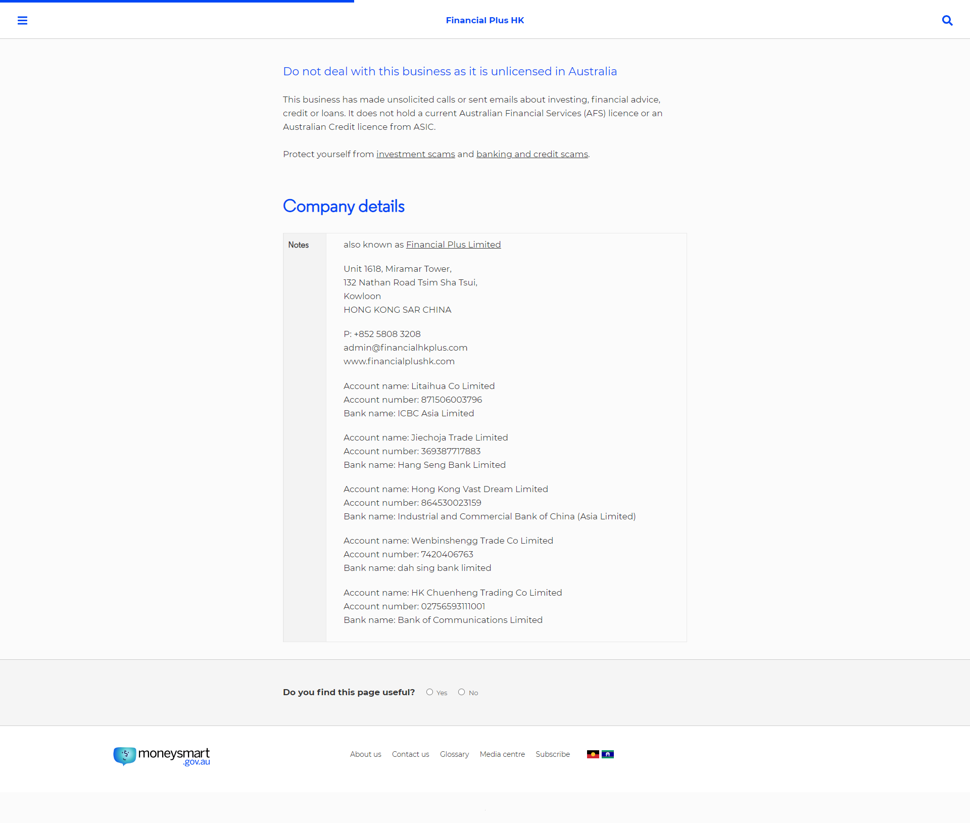 Financial Plushk asic сообщает, что эта компания может быть замешана в мошенничестве. Время чтения страницы: 1 минута на этой странице. Не связывайтесь с этим бизнесом, поскольку он не имеет лицензии в Австралии. . у него нет действующей австралийской лицензии на финансовые услуги (afs) или австралийской кредитной лицензии от asic. защитить себя от инвестиционного мошенничества и банковского и кредитного мошенничества. заметки о компании, также известные как Financial Plus limited unit 1618, miramar tower, 132 nathan road tsim sha tsui, kowloon hong kong sar china p: +852 5808 3208 admin@financialhkplus.com www.financialplushk.com имя счета: litaihua co limited номер счета: 871506003796 название банка: icbc asia ограниченное имя учетной записи: jiechoja trade limited номер учетной записи: 369387717883 название банка: Hang Seng Bank limited имя учетной записи: Гонконг обширная мечта ограниченная номер учетной записи: 864530023159 название банка: Industrial and Commercial Bank of China (asia limited) имя учетной записи: wenbinshengg trade co limited Номер счета: 7420406763 Название банка: dah sing bank limited Имя счета: HK chuenheng Trading Co limited Номер счета: 02756593111001 Название банка: Bank of Communications limited