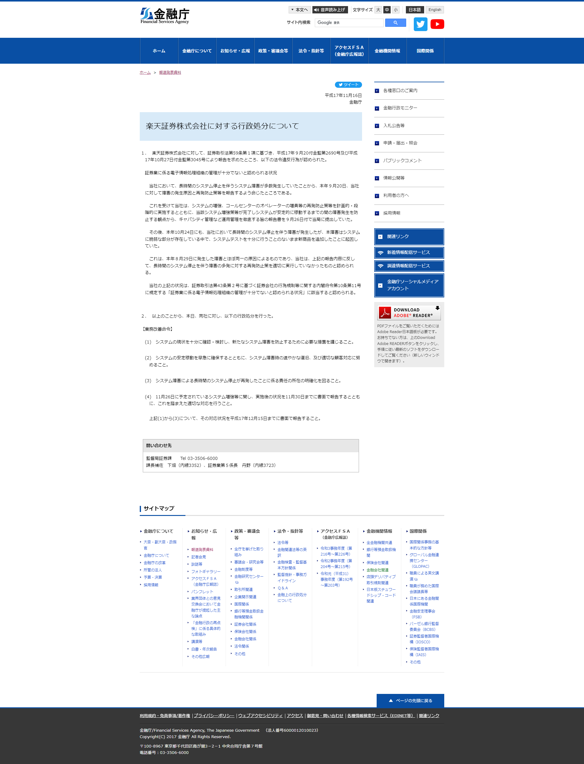 16 ноября 2005 г. Агентство финансовых услуг Rakuten Securities Australia Административные меры в отношении акционерных обществ 1. Rakuten Securities Australia На основании пункта 1 статьи 59 Закона о ценных бумагах и биржах мы запросили у акционерного общества отчет в соответствии с приказом Финансового надзора № 2690 от 20 сентября 2005 г. и Агентства финансового надзора № 3045 от 27 октября 2005 г. Следующие нарушения были найдены законы и постановления. Ситуация, в которой признано, что управление системой электронной обработки информации, связанной с индустрией ценных бумаг, является недостаточным Мне только что было приказано сообщить о причине возникновения и мерах по предотвращению повторения. В ответ на это Компания будет осуществлять мероприятия по предотвращению повторения, такие как усиление системы и увеличение количества операторов колл-центра, в плановом и поэтапном порядке. отчет был представлен властям 26 сентября о том, что будет реализовано тщательное оперативное управление, такое как управление мощностями. После этого, 24 октября 2018 г., у нас также произошел длительный сбой системы из-за добавления новых продуктов без Это связано практически с той же причиной, что и сбой, произошедший 29 августа 2019 г. Вопреки содержанию вышеуказанного отчета, мы приняли соответствующие меры для предотвращения повторения сбоев, вызвавших отказы системы в течение длительного периода времени. Признано, что он не был выполнен вовремя. Вышеупомянутая ситуация нашей компании основана на статье 10-11 Постановления Кабинета министров о законах о правилах для компаний по ценным бумагам на основе статьи 43-2 Закона о ценных бумагах и биржах, в которой говорится, что «управление системами электронной обработки информации, связанными с бизнес с ценными бумагами является адекватным.Признается, что он подпадает под ситуацию, когда признается, что это не так. 2. На основании изложенного сегодня в отношении компании были приняты следующие административные меры. [Приказ об улучшении бизнеса] (1) Полностью подтвердить и изучить текущее состояние системы и принять необходимые меры для предотвращения новых системных сбоев. (2) Обеспечение стабильной работы системы в кратчайшие сроки и стремление к быстрому восстановлению в случае сбоя системы и надлежащее обслуживание клиентов. (3) Уточнить, кто несет ответственность за повторяющиеся длительные сбои в работе системы из-за системных сбоев. (4) Сообщить в письменной форме до 30 ноября о состоянии усовершенствований системы, запланированных на 26 ноября, и принять соответствующие меры на основе этого отчета. Что касается (1)-(3) выше, пожалуйста, сообщите в письменной форме до 15 декабря 2005 г. о статусе ответа.