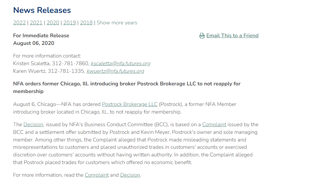 NFA приказывает бывшему брокеру Postrock Brokerage LLC из Чикаго, штат Иллинойс, не подавать повторную заявку на членство.