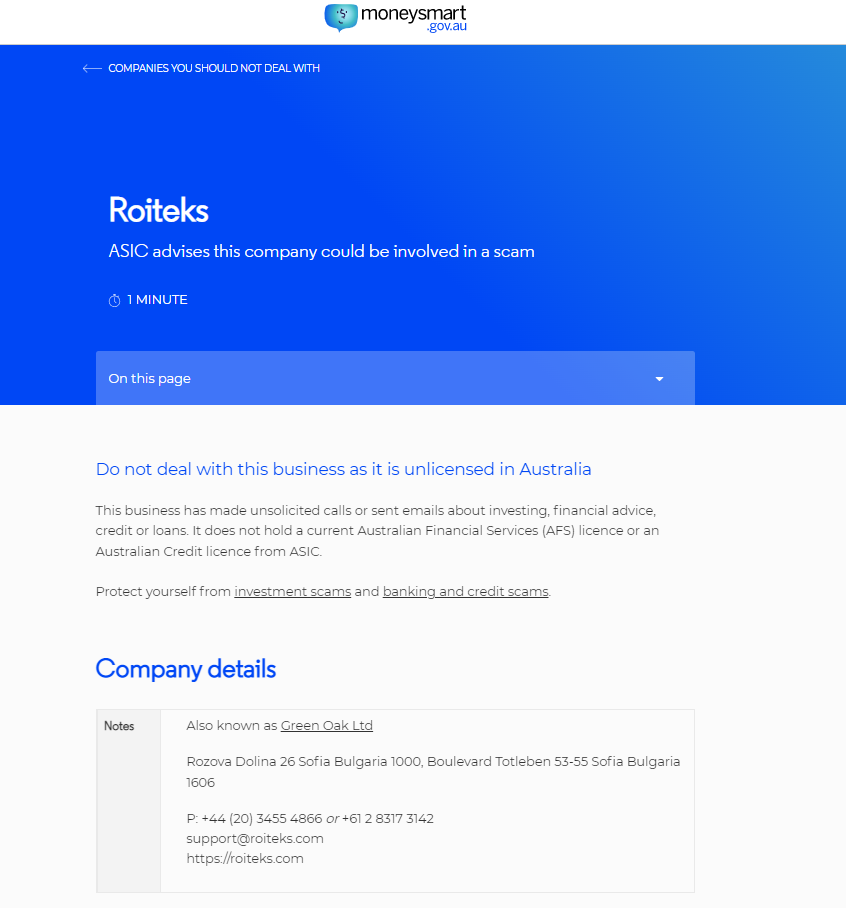 ROITEKSasic сообщает, что эта компания может быть замешана в мошенничестве. Время чтения страницы: 1 минута на этой странице. Не занимайтесь этим бизнесом, поскольку он не имеет лицензии в Австралии. у него нет действующей австралийской лицензии на финансовые услуги (afs) или австралийской кредитной лицензии от asic. защитить себя от инвестиционного мошенничества и банковского и кредитного мошенничества. заметки о компании, также известные как Green Oak LTD розовая долина 26 софия болгария 1000, бульвар тотлебен 53-55 софия болгария 1606 тел: +44 (20) 3455 4866 или +61 2 8317 3142 support@ ROITEKS .com https:// ROITEKS .com