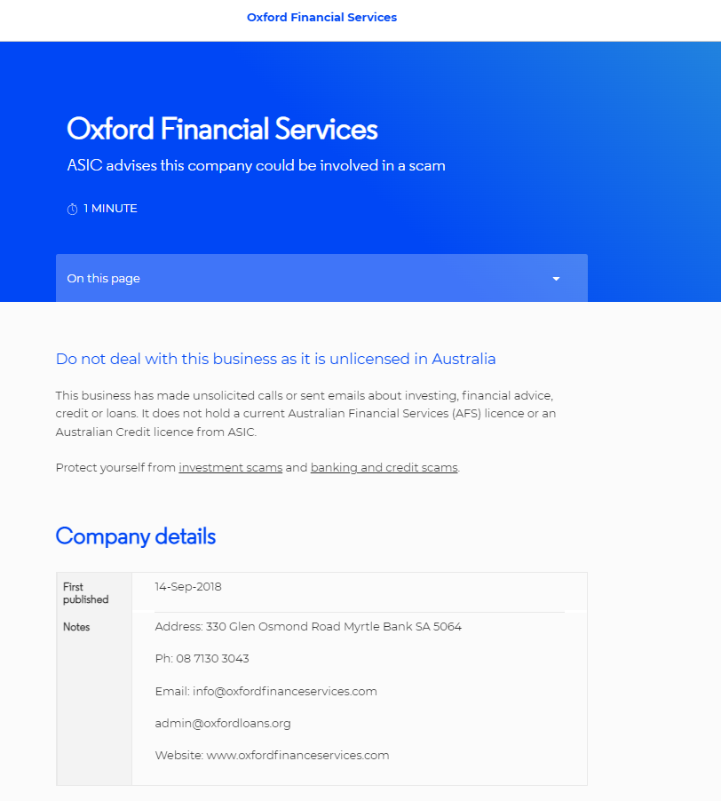 список предупреждений для инвесторов Oxford Financial Services ASIC предупреждает, что эта компания может быть вовлечена в мошенничество.
