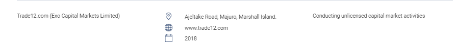 «Этот раздел содержит список несанкционированных веб-сайтов, инвестиционных продуктов, компаний и частных лиц. В этот список входят: лица, осуществляющие или выдающие себя за осуществление следующих регулируемых видов деятельности без лицензии SC: операции с ценными бумагами; операции с деривативами; Управление фондами Консультации по корпоративным финансам Консультации по инвестициям Финансовое планирование Лица, работающие на признанном рынке без разрешения Лица, выпускающие или предлагающие ценные бумаги без одобрения, разрешения или признания Лица, злоупотребляющие логотипом SC и представляющие SC в ложном свете. "Trade12.com (Exo Capital Markets Limited) Ajeltake Road, Majuro, Marshall Island. www.trade12.com 2018 Осуществление нелицензированной деятельности на рынке капитала