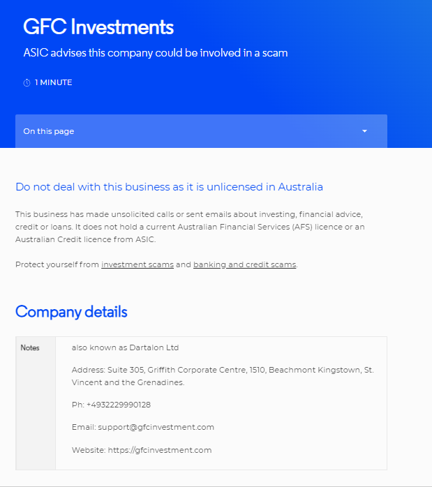 список предупреждений для инвесторов GFC Investments ASIC предупреждает, что эта компания может быть вовлечена в мошенничество.