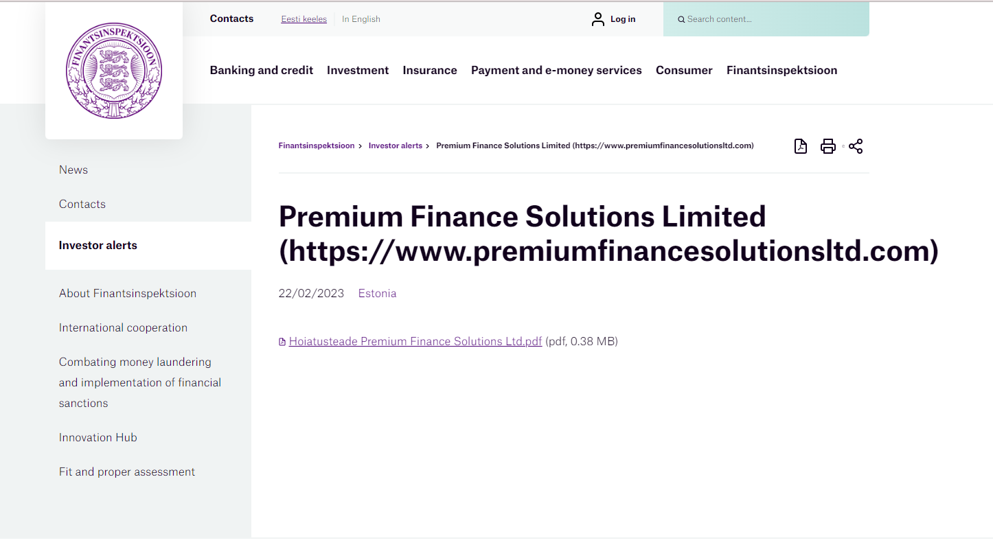 Инвесторские предупреждения Finantsinspektsioon Инвесторское предупреждение - Premium Finance Solutions Limited (https://www.premiumfinancesolutionsltd.com) 22/02/2023 Эстония.