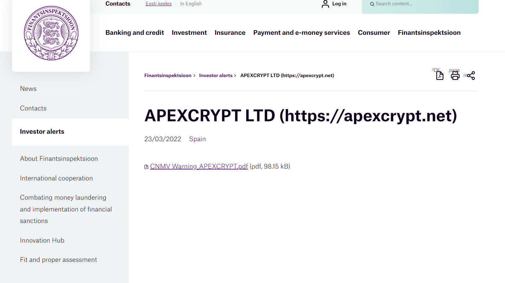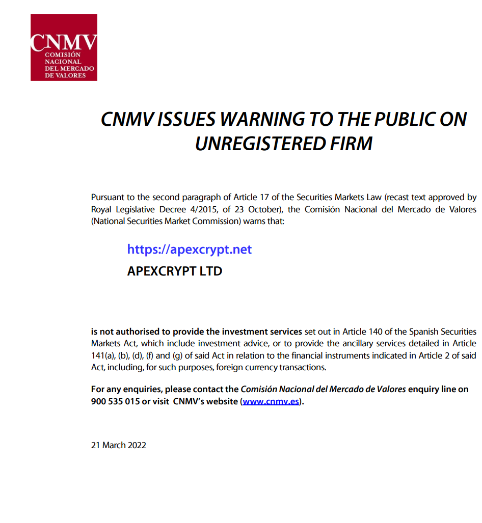 Apexcrypt LTD(https:// ApexCrypt .net) 23.03.2022 Испания CNMV выносит предупреждение общественности в отношении незарегистрированной фирмы в соответствии со вторым параграфом статьи 17 закона о рынках ценных бумаг (переработанный текст утвержден королевским законодательным указом 4/2015 от 23 октября), комиссия nacional del mercado de valores (национальная комиссия по рынку ценных бумаг) предупреждает, что: Apexcrypt LTD не уполномочен предоставлять инвестиционные услуги, указанные в статье 140 испанского закона о рынках ценных бумаг, которые включают инвестиционные консультации, или предоставлять вспомогательные услуги, указанные в статье 141 (a), (b), (d), (f) и (g) указанного действия в отношении финансовых инструментов, указанных в статье 2 указанного закона, включая в этих целях операции в иностранной валюте. По любым вопросам обращайтесь в справочную комиссию по торговле товарами по телефону 900 535 015 или посетите веб-сайт cnmv (www.cnmv.es). 21 марта 2022 г..