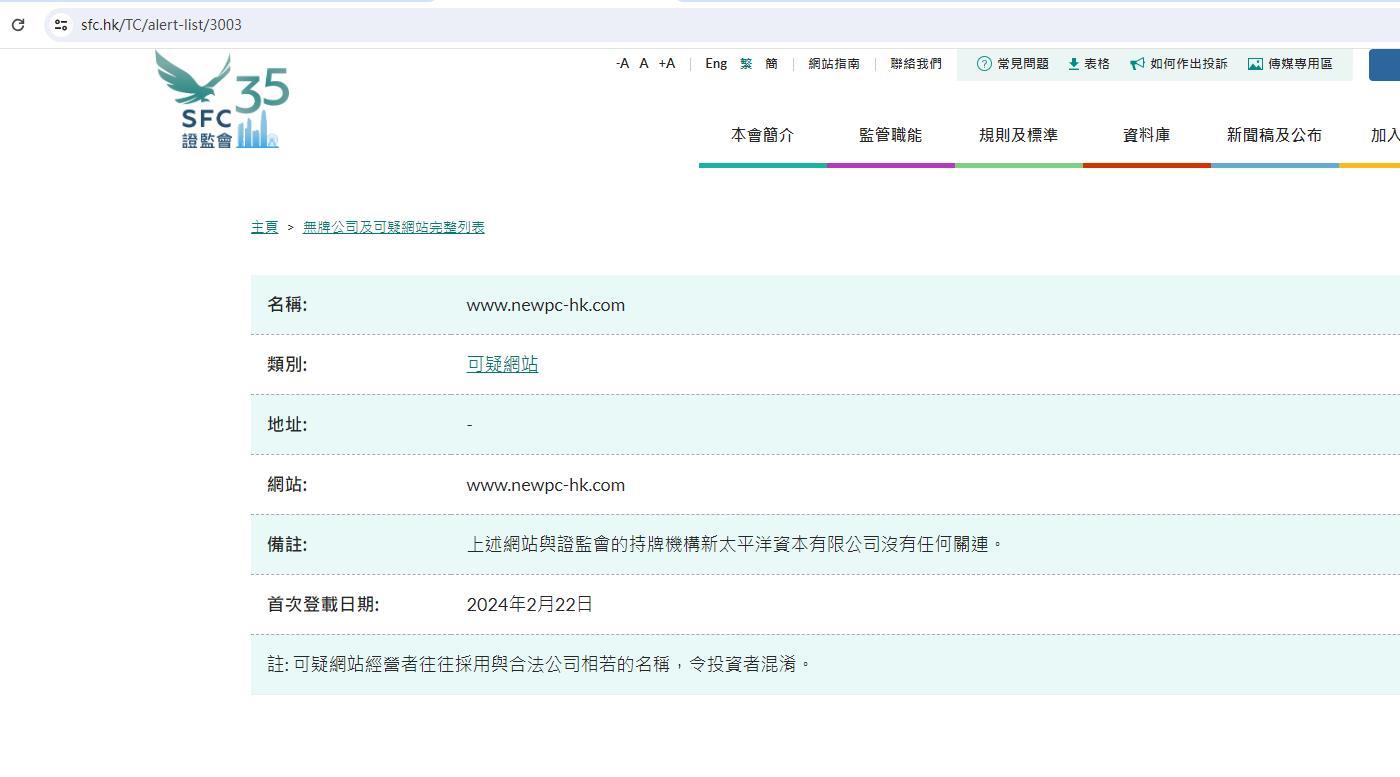 В списке нелицензированных компаний и подозрительных веб-сайтов указаны компании, не имеющие лицензии в Гонконге и привлекшие внимание SFC. Предполагается, что эти компании в настоящее время нацелены или преследовали гонконгских инвесторов или утверждают, что имеют связи с Гонконгом. Вы можете выполнить поиск по названию или категории, чтобы проверить, включена ли компания в список. Этот список не является исчерпывающим. Поскольку Комиссия по ценным бумагам и фьючерсам часто обнаруживает компании или веб-сайты, заслуживающие внимания, мы время от времени будем добавлять в список новые имена. Если с вами связалась нелицензированная компания, воспользуйтесь нашей онлайн-формой жалобы. Для получения дополнительной информации о котельных, мошеннических веб-сайтах и поддельных электронных письмах щелкните соответствующие ссылки. Примечание. Список нелицензированных компаний и подозрительных веб-сайтов призван как можно раньше предупредить инвесторов. Инвесторы не должны полагаться исключительно на информацию из приведенного выше списка и должны сами тщательно проверять данные отдельных компаний. Пожалуйста, выберите первую английскую букву названия в каждом столбце, чтобы просмотреть список, или нажмите на столбец «Китайское название», чтобы просмотреть только компании с китайскими названиями. Имя: www.newpc-hk.com Категория: Адрес подозрительного веб-сайта: - Веб-сайт: www.newpc-hk.com Примечание: указанный выше веб-сайт не имеет никакого отношения к New Pacific Capital Limited, лицензированному учреждению Комиссии по ценным бумагам и фьючерсам. Дата первой публикации: 22 февраля 2024 г. Примечание. Операторы подозрительных веб-сайтов часто используют названия, похожие на названия законных компаний, что сбивает с толку инвесторов.