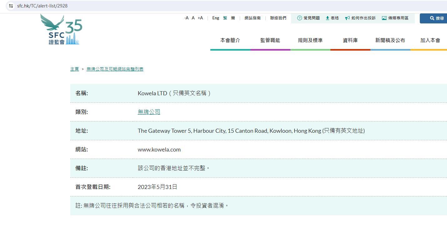В списке нелицензированных компаний и подозрительных веб-сайтов указаны компании, не имеющие лицензии в Гонконге и привлекшие внимание SFC. Предполагается, что эти компании в настоящее время нацелены или преследовали гонконгских инвесторов или утверждают, что имеют связи с Гонконгом. Вы можете выполнить поиск по названию или категории, чтобы проверить, включена ли компания в список. Этот список не является исчерпывающим. Поскольку Комиссия по ценным бумагам и фьючерсам часто обнаруживает компании или веб-сайты, заслуживающие внимания, мы время от времени будем добавлять в список новые имена. Если с вами связалась нелицензированная компания, воспользуйтесь нашей онлайн-формой жалобы. Для получения дополнительной информации о котельных, мошеннических веб-сайтах и поддельных электронных письмах щелкните соответствующие ссылки. Примечание. Список нелицензированных компаний и подозрительных веб-сайтов призван как можно раньше предупредить инвесторов. Инвесторы не должны полагаться исключительно на информацию из приведенного выше списка и должны сами тщательно проверять данные отдельных компаний. Пожалуйста, выберите первую английскую букву названия в каждом столбце, чтобы просмотреть список, или нажмите на столбец «Китайское название», чтобы просмотреть только компании с китайскими названиями. " Имя: Kowela ltd (только английское название) Категория: Компания без лицензии Адрес: Gate Tower 5, Harbour City, 15 Canton Road, Коулун, Гонконг (только адрес на английском языке) Веб-сайт: www. Kowela .com Примечание. Адрес этой компании в Гонконге неполный. Дата первой публикации: 31 мая 2023 г. Примечание. Нелицензионные компании часто используют названия, похожие на названия юридических компаний, что сбивает с толку инвесторов.