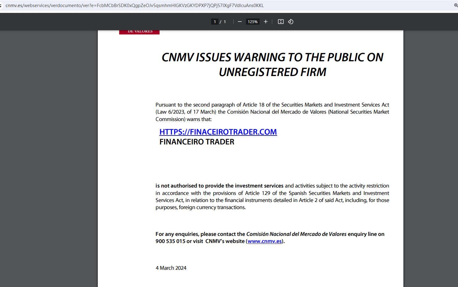 cnmv выносит предупреждение общественности в отношении незарегистрированной фирмы в соответствии со вторым параграфом статьи 18 Закона о рынках ценных бумаг и инвестиционных услугах (закон 6/2023 от 17 марта). Национальная комиссия по рынку ценных бумаг (comisión nacional del mercado de valores) предупреждает, что : https:// Finaceirotrader Трейдер .comfinanceiro не уполномочен предоставлять инвестиционные услуги и деятельность, на которую распространяется ограничение деятельности в соответствии с положениями статьи 129 испанского закона о рынках ценных бумаг и инвестиционных услугах в отношении финансовых инструментов, подробно описанных в статье 2 указанного закона. , включая в этих целях операции в иностранной валюте. По любым вопросам обращайтесь в справочную комиссию по торговле товарами по телефону 900 535 015 или посетите веб-сайт cnmv (www.cnmv.es). 4 марта 2024 г. .