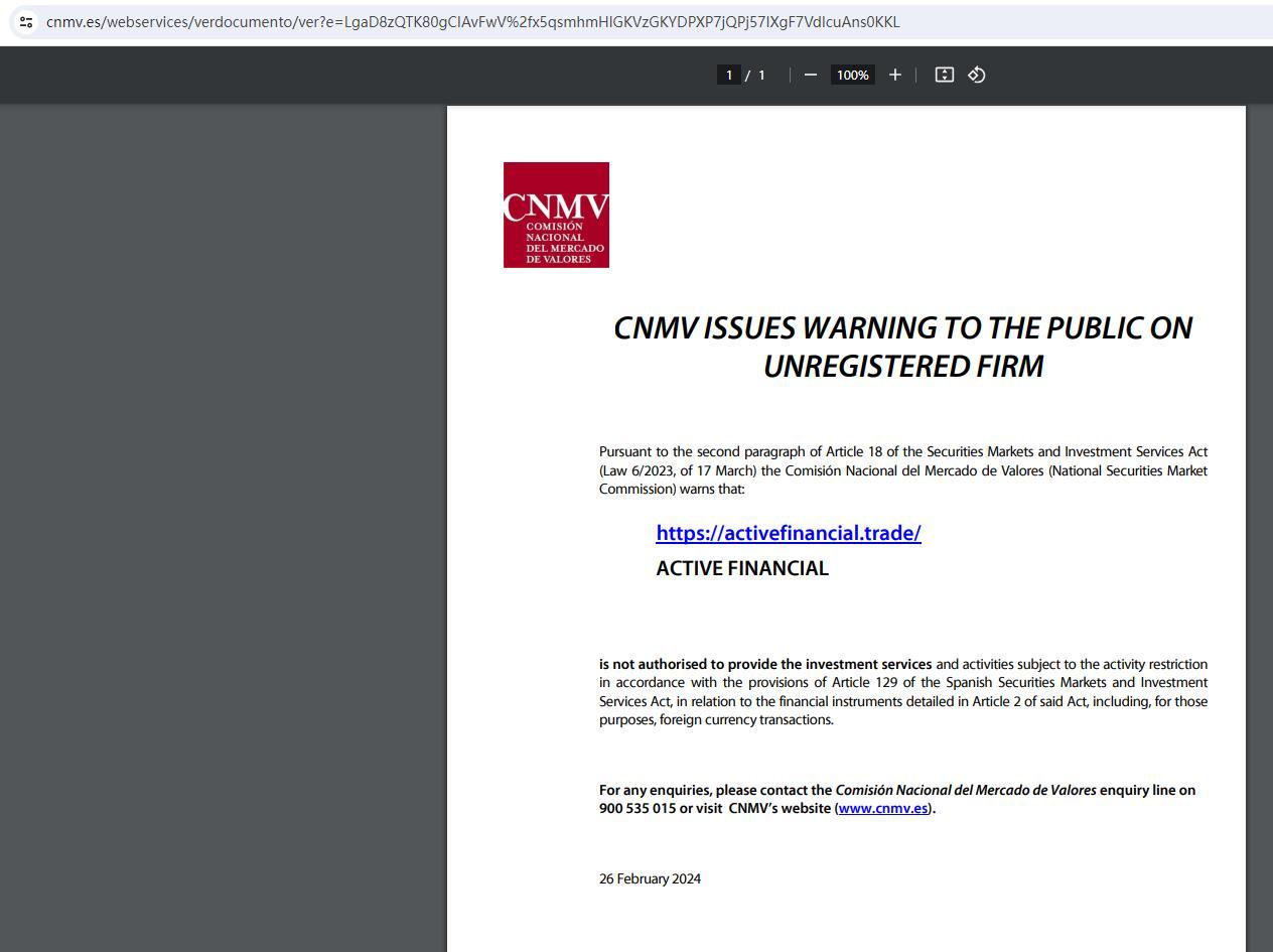 cnmv выносит предупреждение общественности в отношении незарегистрированной фирмы в соответствии со вторым параграфом статьи 18 Закона о рынках ценных бумаг и инвестиционных услугах (закон 6/2023 от 17 марта). Национальная комиссия по рынку ценных бумаг (comisión nacional del mercado de valores) предупреждает, что : https://activefinancial.trade/ Active Financial не уполномочен предоставлять инвестиционные услуги и деятельность, на которую распространяется ограничение деятельности в соответствии с положениями статьи 129 испанского закона о рынках ценных бумаг и инвестиционных услугах в отношении финансовых инструментов, указанных в статье 2 указанного закона, в том числе, для В этих целях осуществляются валютные операции. По любым вопросам обращайтесь в справочную комиссию по торговле товарами по телефону 900 535 015 или посетите веб-сайт cnmv (www.cnmv.es). 26 февраля 2024 г.
