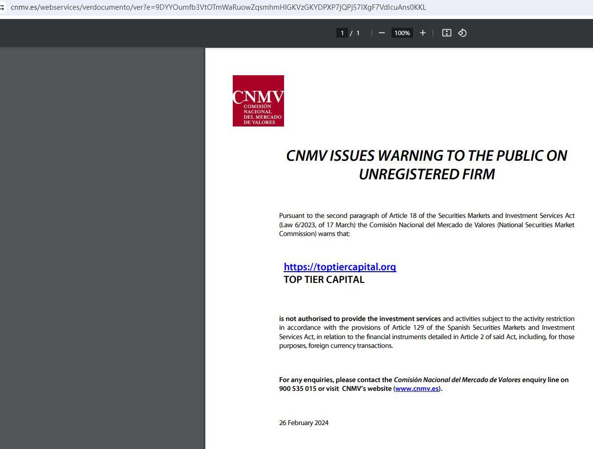 cnmv выносит предупреждение общественности в отношении незарегистрированной фирмы в соответствии со вторым параграфом статьи 18 Закона о рынках ценных бумаг и инвестиционных услугах (закон 6/2023 от 17 марта). Национальная комиссия по рынку ценных бумаг (comisión nacional del mercado de valores) предупреждает, что : https:// TopTierCapital Капитал высшего уровня .org не уполномочен предоставлять инвестиционные услуги и деятельность, на которую распространяется ограничение деятельности в соответствии с положениями статьи 129 испанского закона о рынках ценных бумаг и инвестиционных услугах в отношении финансовых инструментов, подробно описанных в статье 2 указанного закона. действовать, включая в этих целях операции в иностранной валюте. По любым вопросам обращайтесь в справочную комиссию по торговле товарами по телефону 900 535 015 или посетите веб-сайт cnmv (www.cnmv.es). 26 февраля 2024 г.