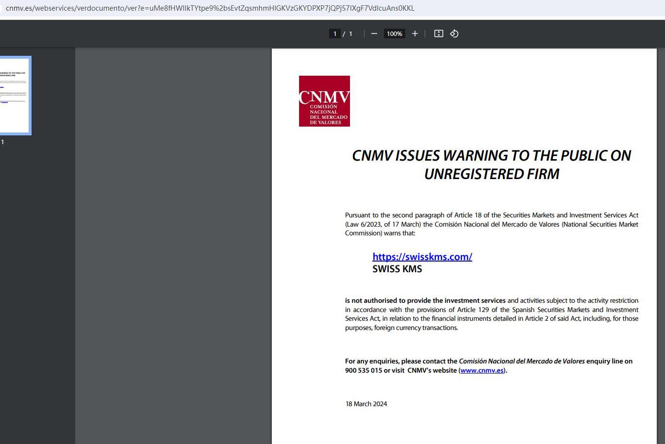 cnmv выносит предупреждение общественности в отношении незарегистрированной фирмы в соответствии со вторым параграфом статьи 18 Закона о рынках ценных бумаг и инвестиционных услугах (закон 6/2023 от 17 марта). Национальная комиссия по рынку ценных бумаг (comisión nacional del mercado de valores) предупреждает, что : https://swisskms.com/ Swiss KMS не уполномочен предоставлять инвестиционные услуги и деятельность, на которую распространяется ограничение деятельности в соответствии с положениями статьи 129 испанского закона о рынках ценных бумаг и инвестиционных услугах в отношении финансовых инструментов, указанных в статье 2 указанного закона, в том числе, для В этих целях осуществляются валютные операции. По любым вопросам обращайтесь в справочную комиссию по торговле товарами по телефону 900 535 015 или посетите веб-сайт cnmv (www.cnmv.es). 18 марта 2024 г.