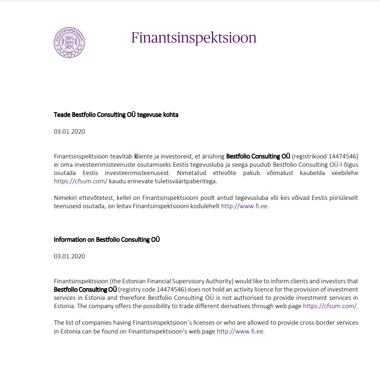 уведомление о деятельности bestfolio Consulting oü 03.01.2020 Финансовая инспекция информирует клиентов и инвесторов о том, что компания bestfolio Consulting oü (регистрационный код 14474546) не имеет лицензии на деятельность по оказанию инвестиционных услуг в Эстонии и поэтому bestfolio Consulting oü не имеет права оказывать инвестиционные услуги в Эстонии. указанная компания предлагает возможность торговать на сайте https:// CFsum .com/ с различными производными. Список компаний, имеющих лицензию Финансовой инспекции на деятельность или которые могут оказывать услуги за границей в Эстонии, можно найти на сайте Финансовой инспекции по адресу http://www.fi.ee. информация о bestfolio Consulting oü 03.01.2020 finansinspektsioon (орган финансового надзора Эстонии) сообщает клиентам и инвесторам, что bestfolio Consulting oü (регистрационный код 14474546) не имеет лицензии на деятельность по предоставлению инвестиционных услуг в Эстонии и, следовательно, bestfolio Consulting oü не уполномочен предоставлять инвестиционные услуги в Эстонии. компания предлагает возможность торговать различными деривативами через веб-страницу https:// CFsum .com/. Список компаний, имеющих лицензии финансовой инспекции или которым разрешено оказывать трансграничные услуги в Эстонии, можно найти на домашней странице финансовой инспекции http://www.fi.ee.