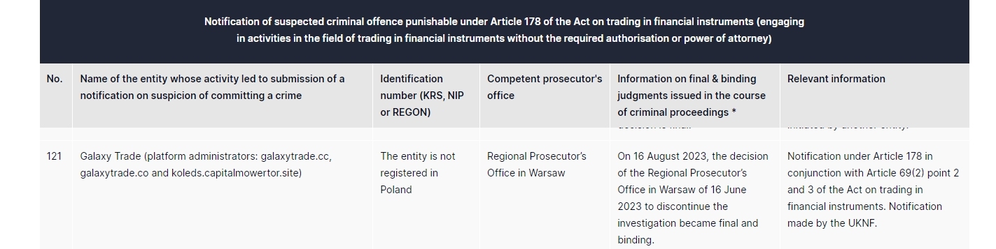 galaxy trade (администраторы платформы: GalaxyTrade .cc, GalaxyTrade .co и koleds.capitalmowertor.site) юридическое лицо не зарегистрировано в Польше областной прокуратурой Варшавы 16 августа 2023 года, решение областной прокуратуры Варшавы от 16 июня 2023 года о прекращении расследования стало окончательным и обязательным к исполнению. уведомление в соответствии со статьей 178 в сочетании со статьей 69(2), пунктами 2 и 3 закона о торговле финансовыми инструментами. уведомление, сделанное укнф.