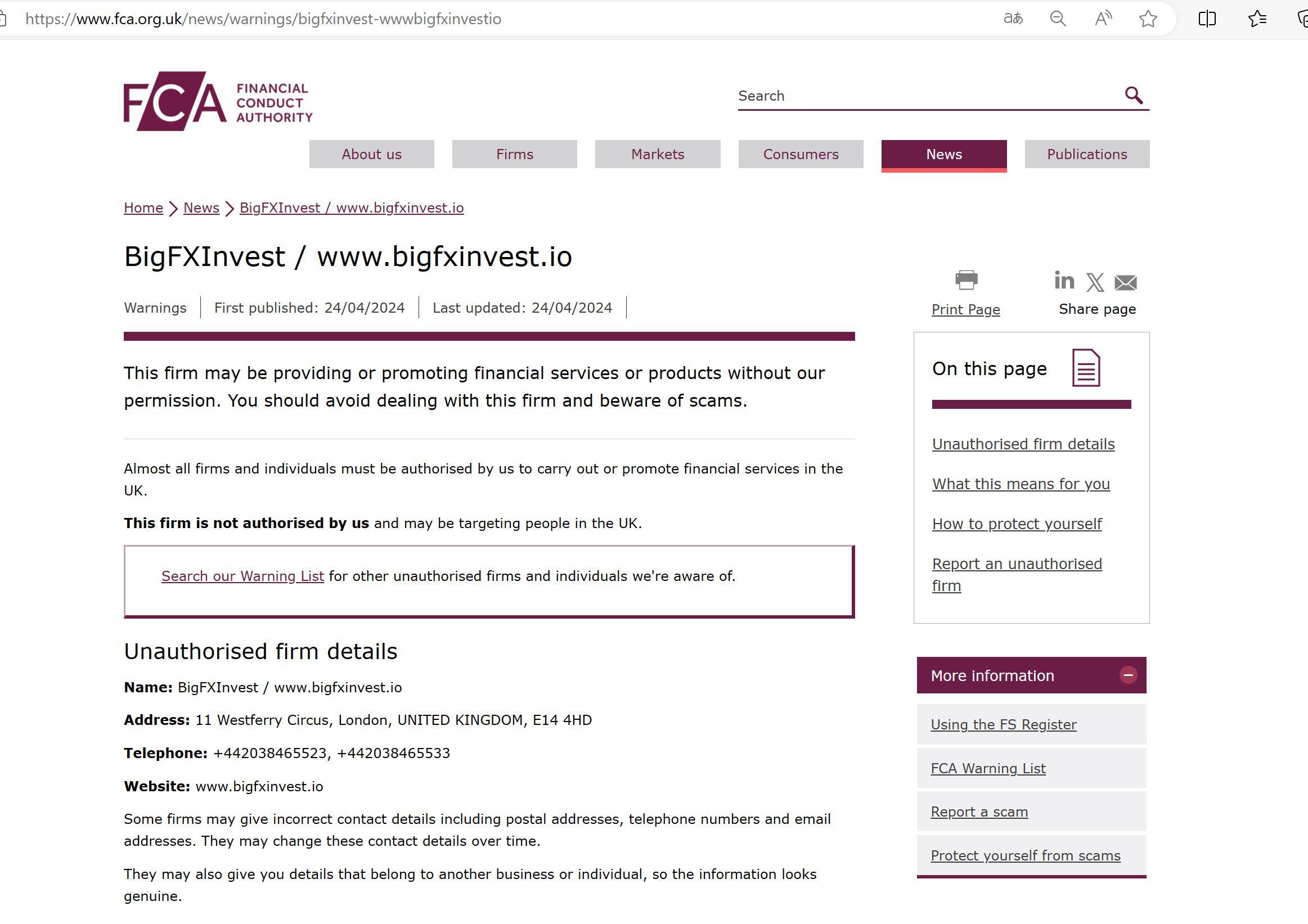первая публикация: 24.04.2024 последнее обновление: 24.04.2024 эта фирма может предоставлять или продвигать финансовые услуги или продукты без нашего разрешения. Вам следует избегать сотрудничества с этой фирмой и остерегаться мошенничества. почти все фирмы и частные лица должны быть авторизованы нами для оказания или продвижения финансовых услуг в Великобритании. эта фирма не авторизована нами и может быть нацелена на людей в Великобритании. найдите в нашем списке предупреждений другие известные нам неавторизованные фирмы и частных лиц. неавторизованное название фирмы: BigFXInvest / www. BigFXInvest Адрес .io: 11 Westferry Circus, Лондон, Великобритания, e14 4hd Телефон: +442038465523, +442038465533 Веб-сайт: www. BigFXInvest .io некоторые фирмы могут предоставлять неверные контактные данные, включая почтовые адреса, номера телефонов и адреса электронной почты. они могут со временем изменить эти контактные данные. они также могут предоставить вам данные, принадлежащие другому предприятию или частному лицу, чтобы информация выглядела подлинной.