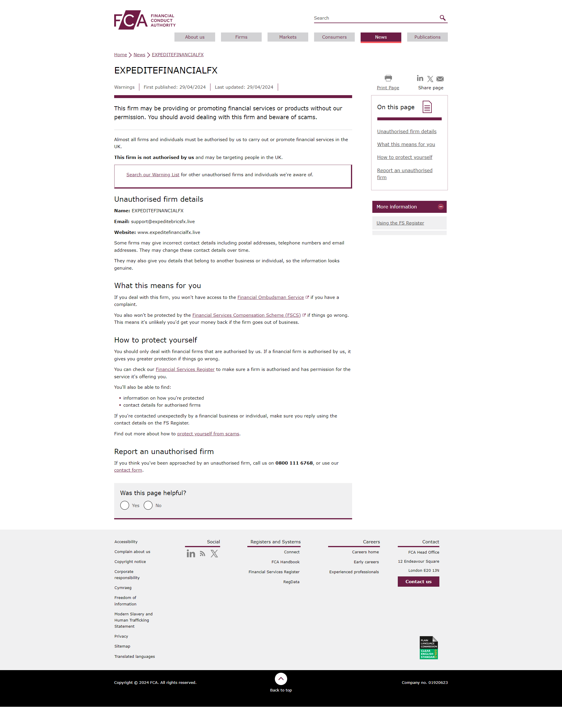 Предупредительный список FCA о неавторизованных компаниях EXPEDITEFINANCIALFX.