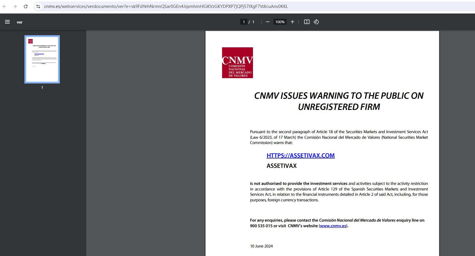 cnmv предупреждает общественность о незарегистрированной фирме в соответствии со вторым абзацем статьи 18 закона о рынках ценных бумаг и инвестиционных услугах (закон 6/2023 от 17 марта) comisión nacional del mercado de valores (национальная комиссия по рынку ценных бумаг) предупреждает, что: https:// Assetivax .ком Assetivax не уполномочена предоставлять инвестиционные услуги и виды деятельности, подпадающие под ограничение деятельности в соответствии с положениями статьи 129 Закона о рынках ценных бумаг и инвестиционных услугах Испании в отношении финансовых инструментов, указанных в статье 2 указанного Закона, включая, для этих целей, операции с иностранной валютой. По любым вопросам обращайтесь на линию по работе с клиентами Национальной комиссии по рынку ценных бумаг по телефону 900 535 015 или посетите веб-сайт CNMV (www.cnmv.es). 10 июня 2024 г.