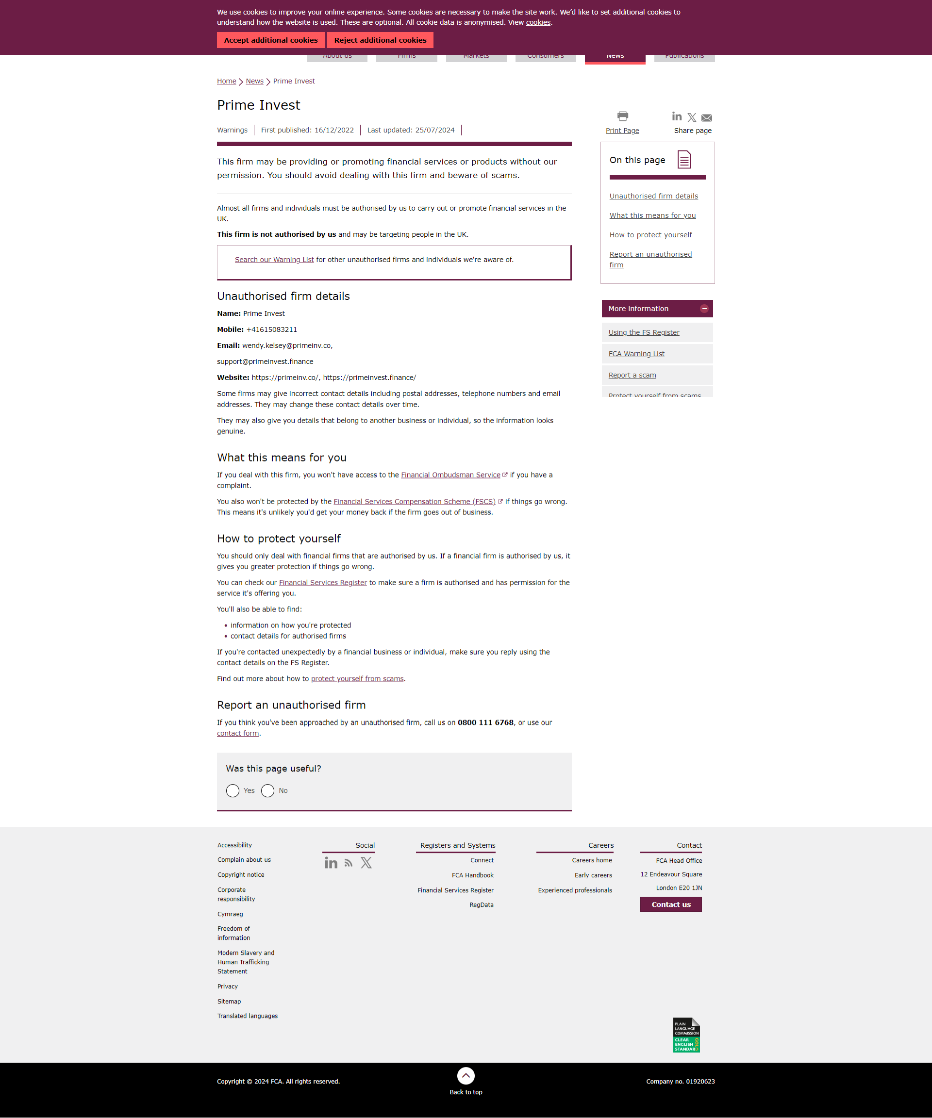 Предупреждающий список FCA о неавторизованных компаниях Prime Invest.