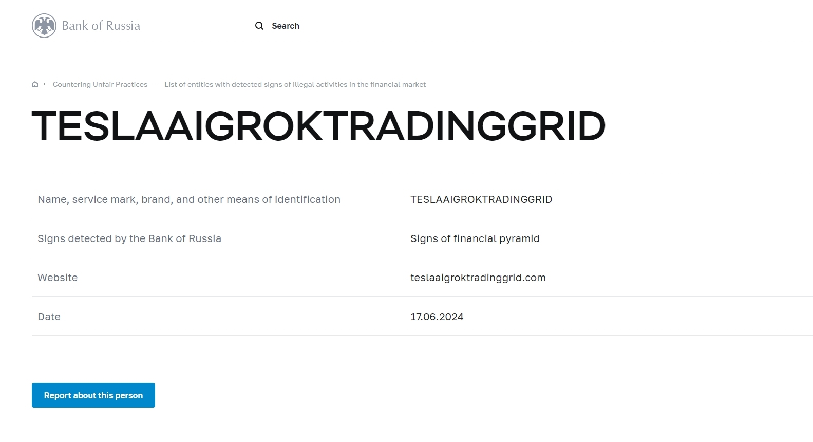 Наименование, знак обслуживания, бренд и иные средства индивидуализации TESLAAIGROKTRADINGGRID Признаки, выявленные Банком России Признаки финансовой пирамиды Сайт teslaaigroktradinggrid.com Дата 17.06.2024